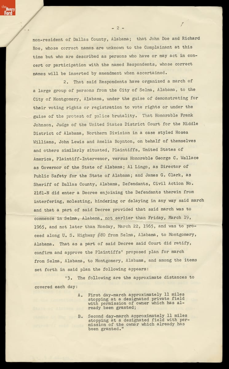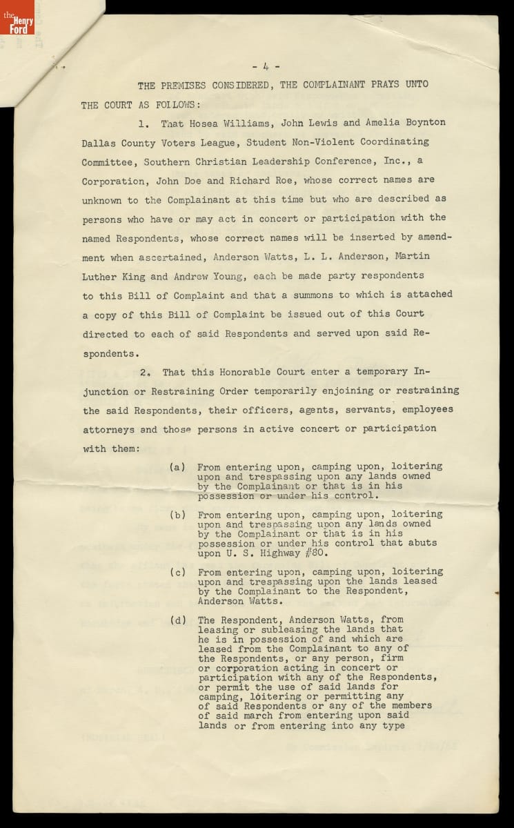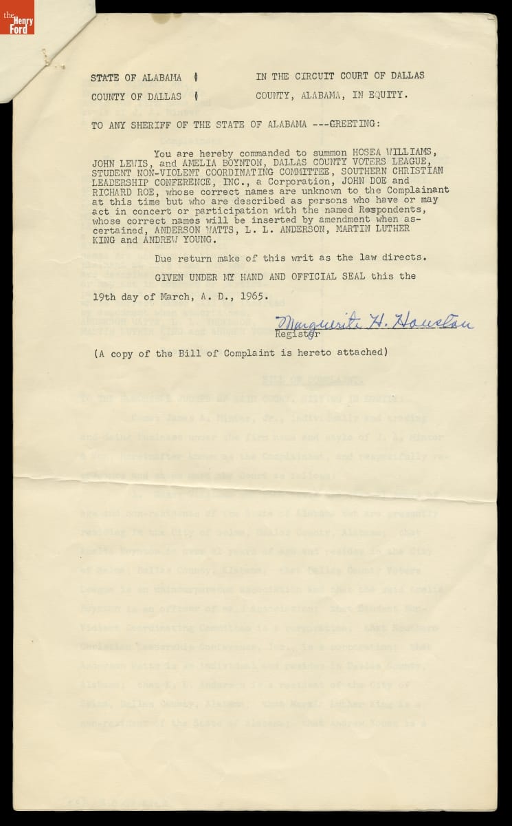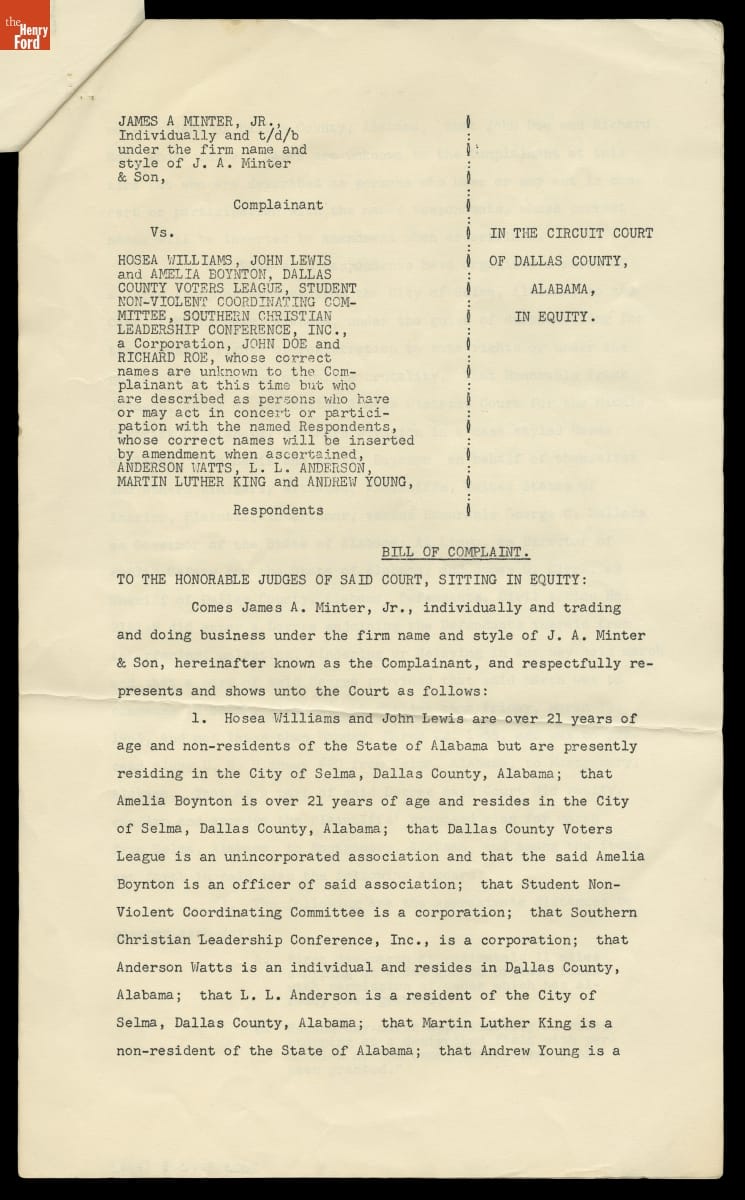 Injunction Filed by James A. Minter, Jr. of Selma, Alabama against Voting Rights Protesters on His Land, March 19, 1965