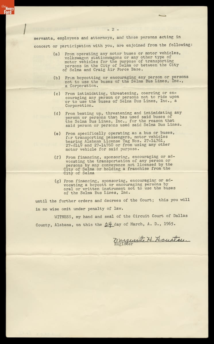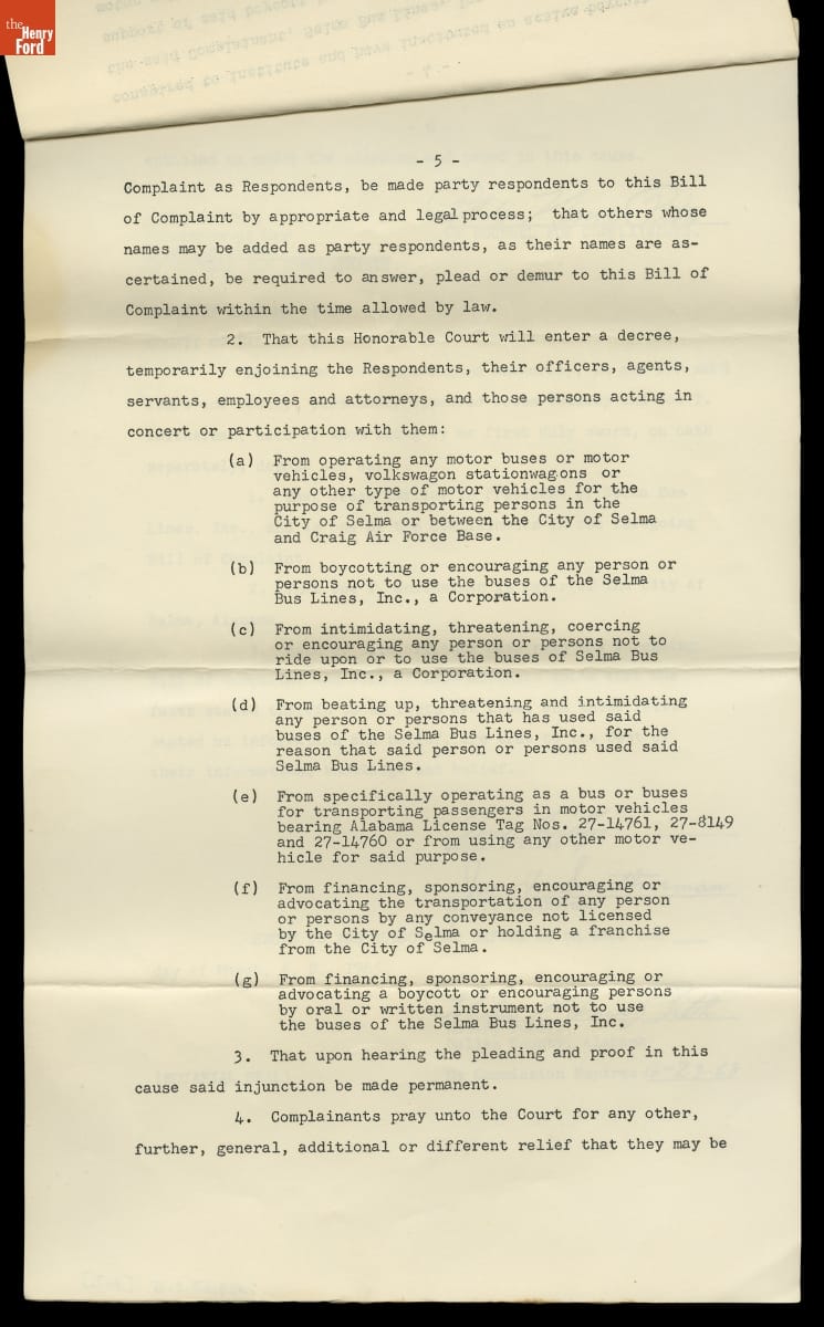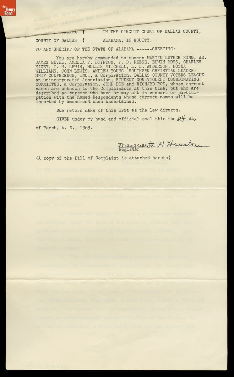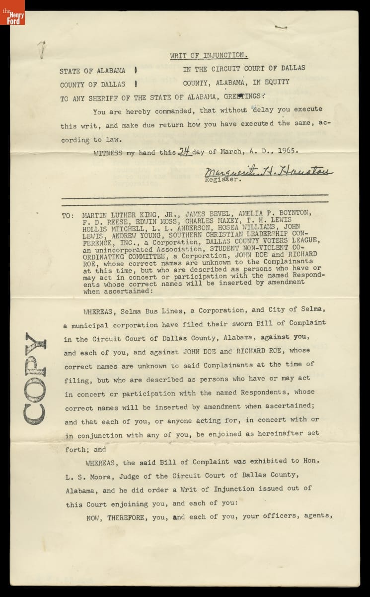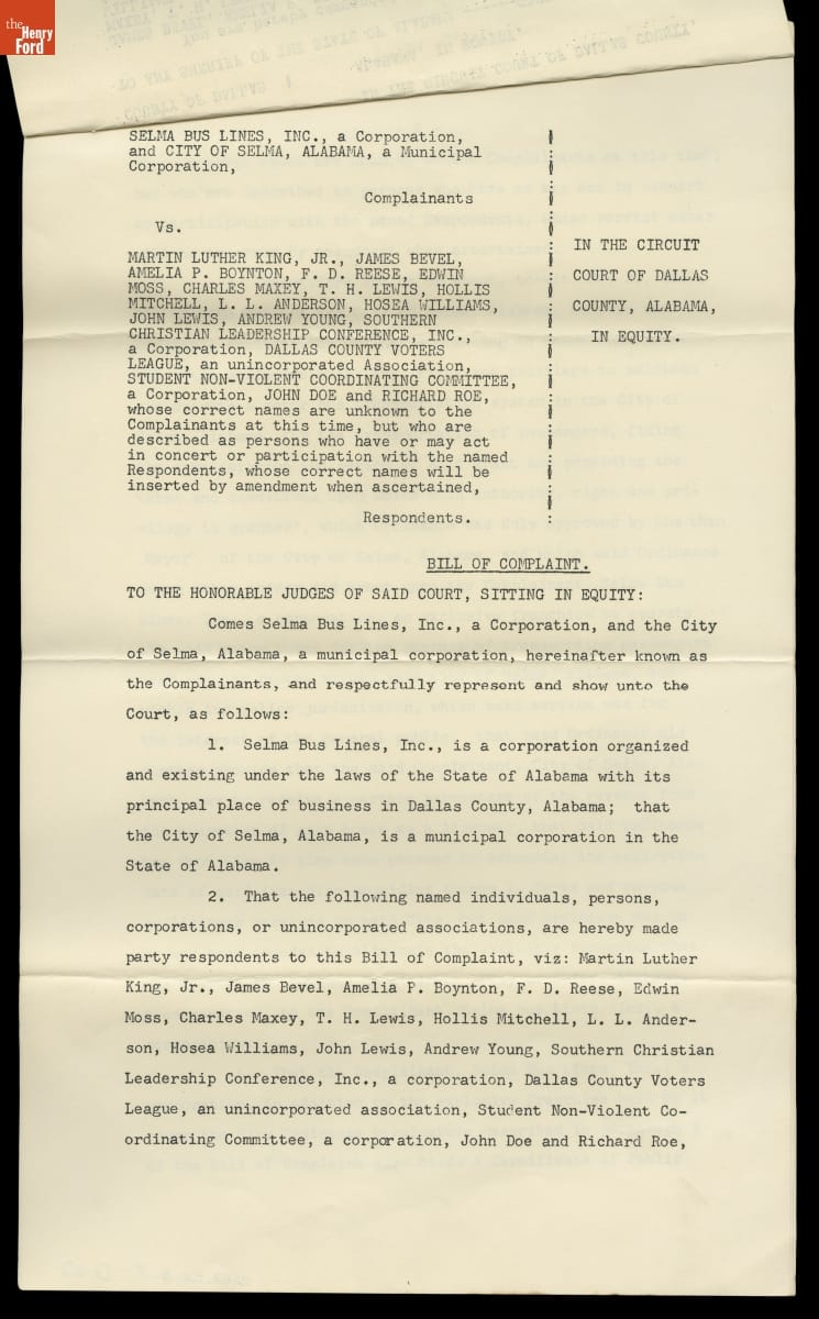 Injunction Filed by Selma Bus Lines and City of Selma, Alabama, against Martin Luther King, Jr. and Voting Rights Protesters, March 24, 1965