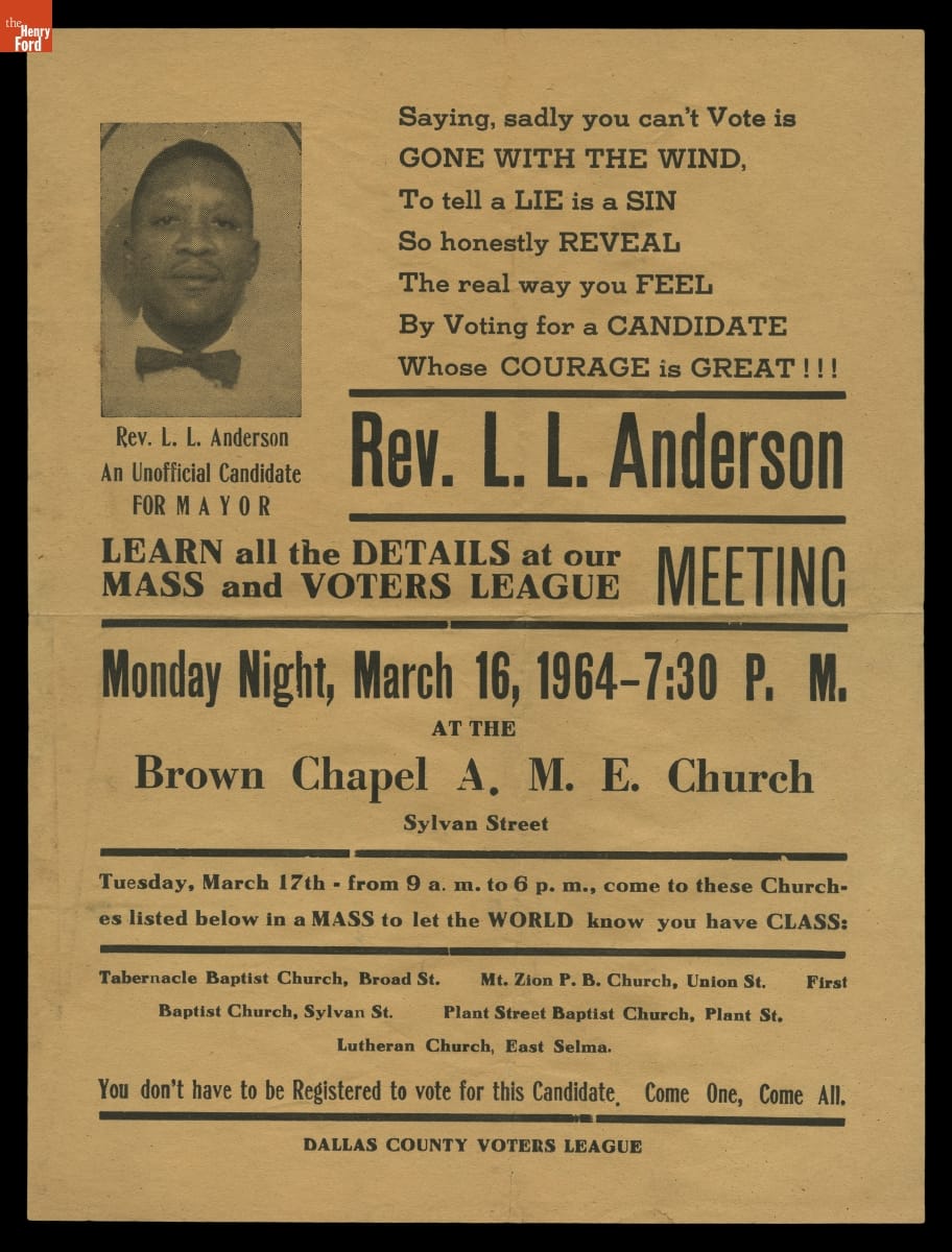 Notice of Mass and Voter's League Meeting at the Brown Chapel A.M.E. Church, Selma, Alabama, March 16, 1964