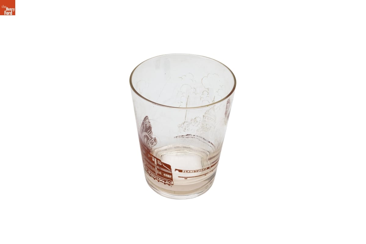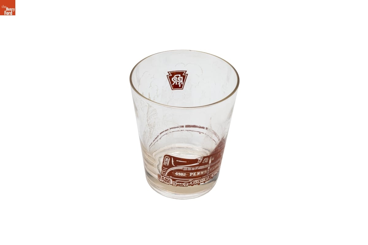From its founding in 1867 until its demise a century later, Pullman was synonymous with first-class travel on American railroads. The company built sleeping cars and operated them under contract with host railroads. This drinking glass was used on Pennsylvania Railroad passenger trains. The glass featured a GG1 electric locomotive and promoted PRR's service to Washington, D.C.