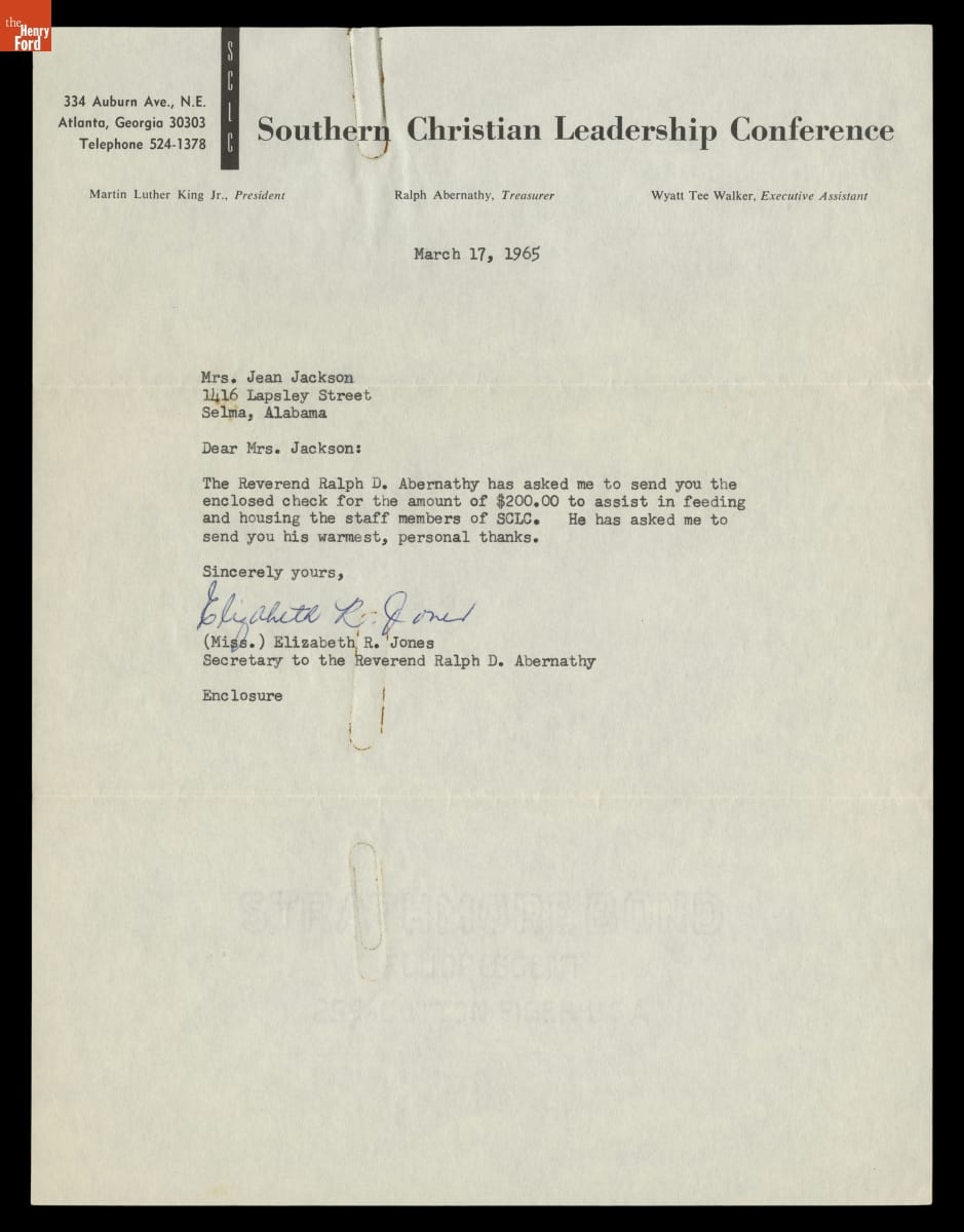 Letter from Southern Christian Leadership Conference to Richie Jean Jackson with Thanks for Her Hospitality, March 17, 1965
