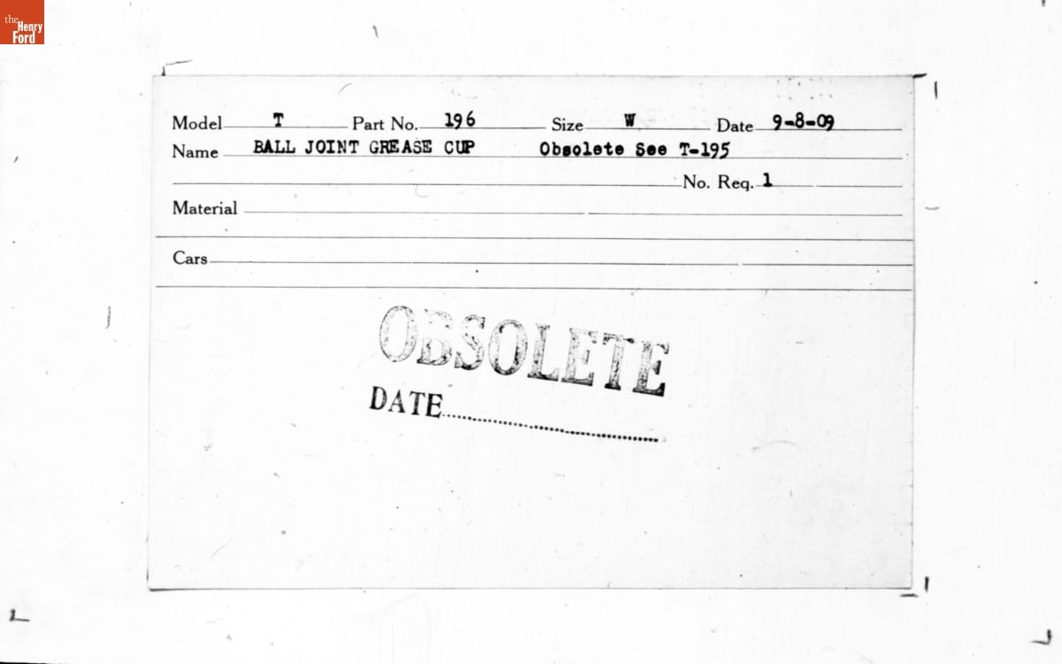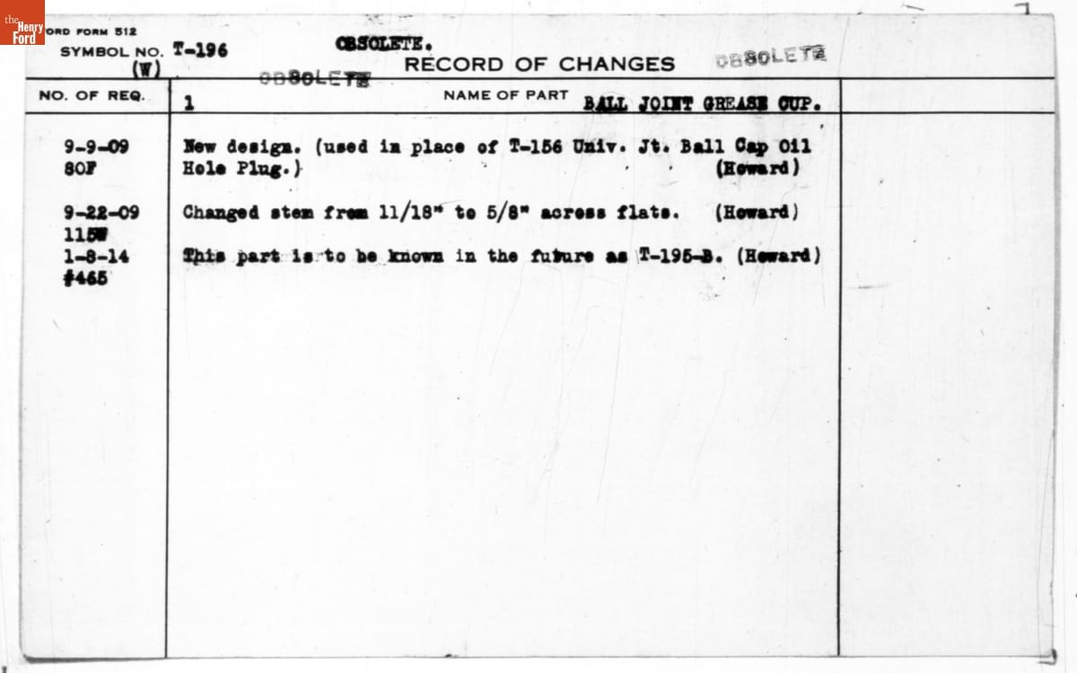 Engineering Release Notes, Ball Joint Grease Cup, Ford Model T, 1909-1914
