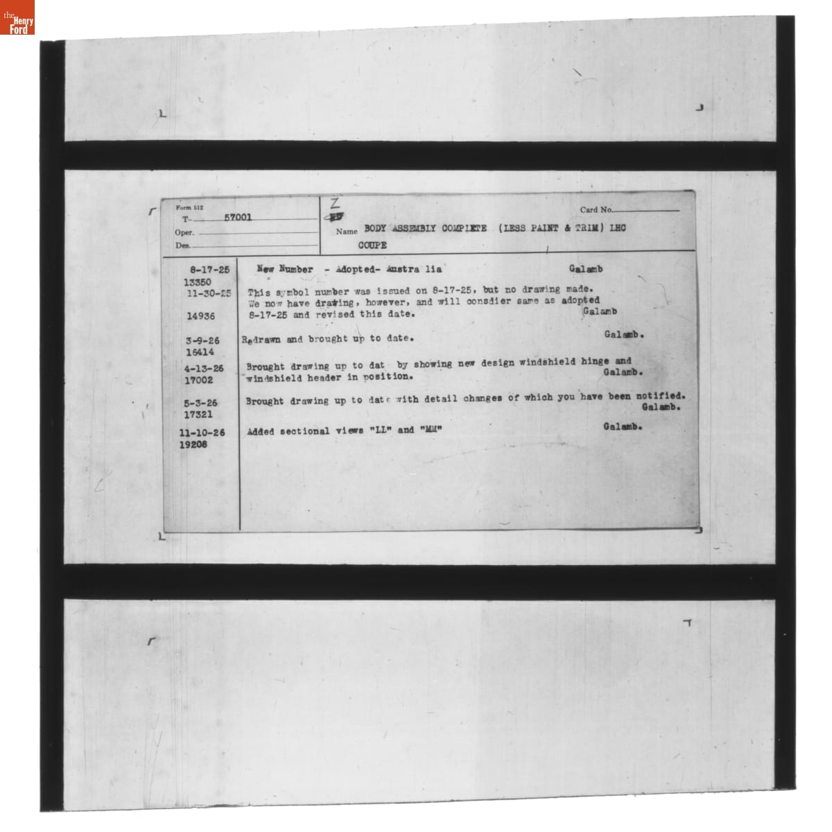 The Ford Motor Company created over a million parts drawings from 1903 to 1957. Many of these drawings specify engineering requirements for the components of Ford-made vehicles--including automobiles, trucks, tractors, military vehicles, and Tri-motor airplanes. Others provided information about assembly components, stages of casting and forging, or experimental designs. Beginning in the 1940s, Ford transferred the drawings and associated documents to microfilm.