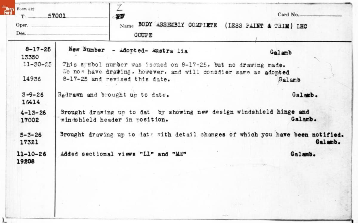 Engineering Release Notes, Coupe Body Assembly, Ford Model T, 1925-1926