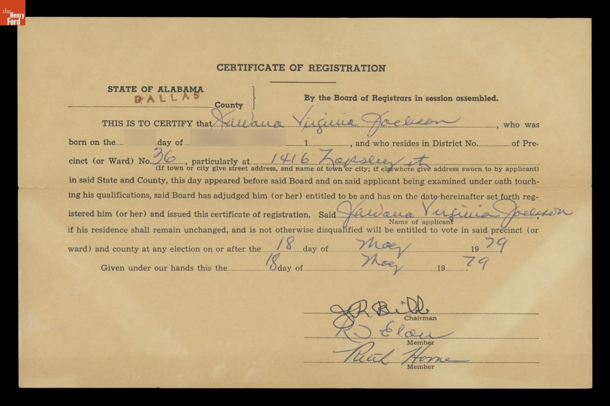 Voter Registration Certificate for Jawana Virginia Jackson, Dallas County, Alabama, May 18, 1979
