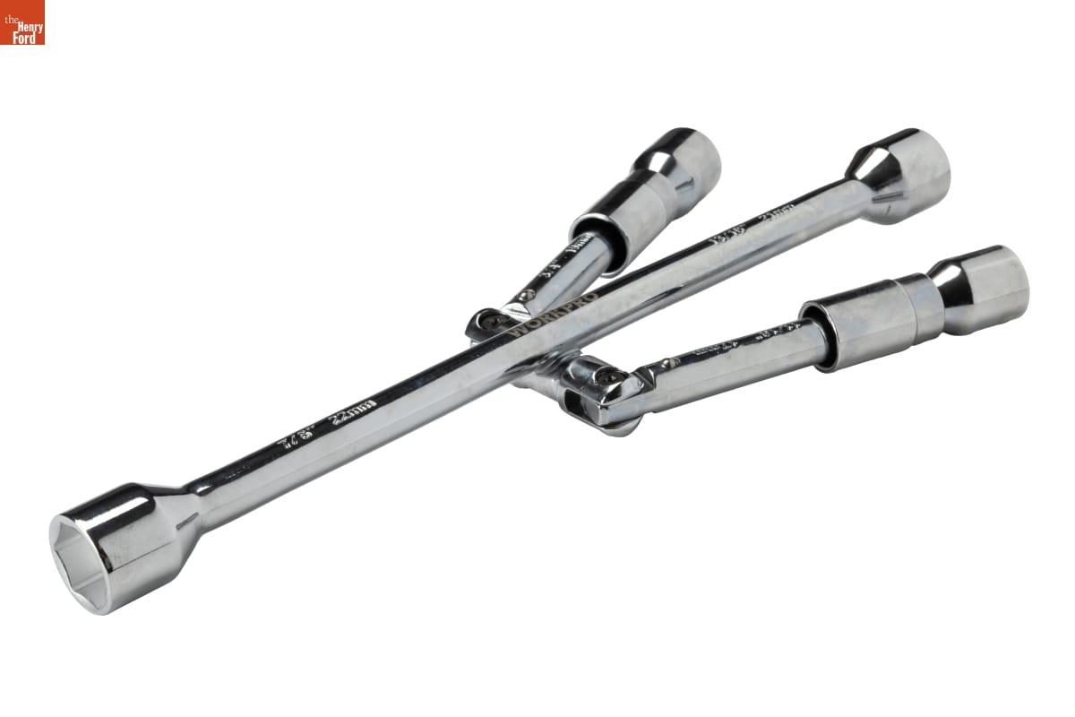 The X-shaped lug wrench, sometimes called a spider wrench, is an essential tool in the event of a flat tire. Its four differently sized sockets are designed for removing the lug nuts that hold a car's wheel onto its axle. This lug wrench can be folded into a smaller shape for easier storage.