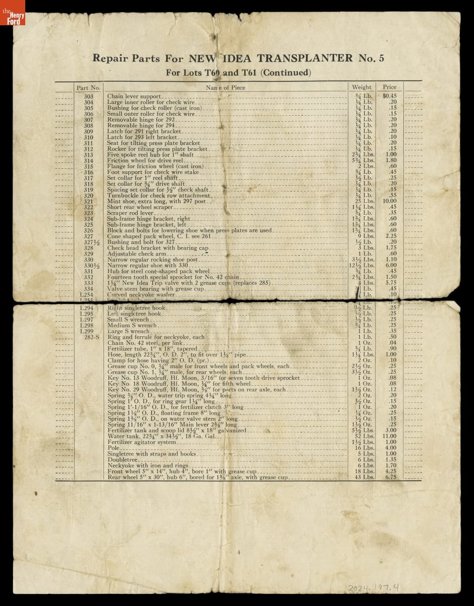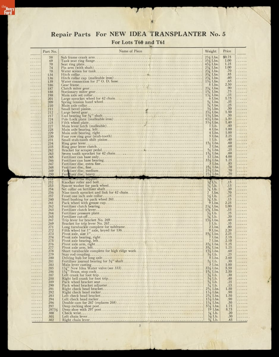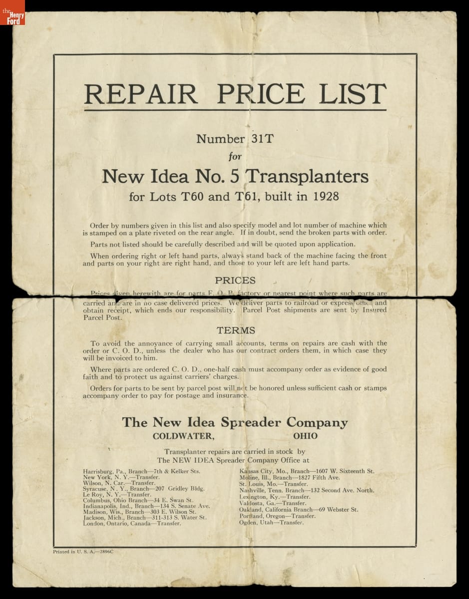 "Repair Parts List Number 31T for New Idea No. 5 Transplanters for Lots T60 and T61, Built in 1928"