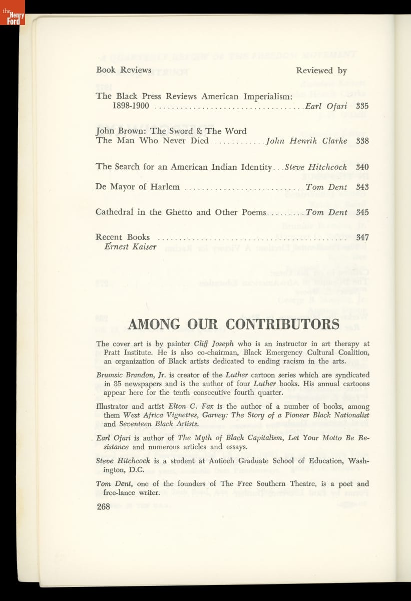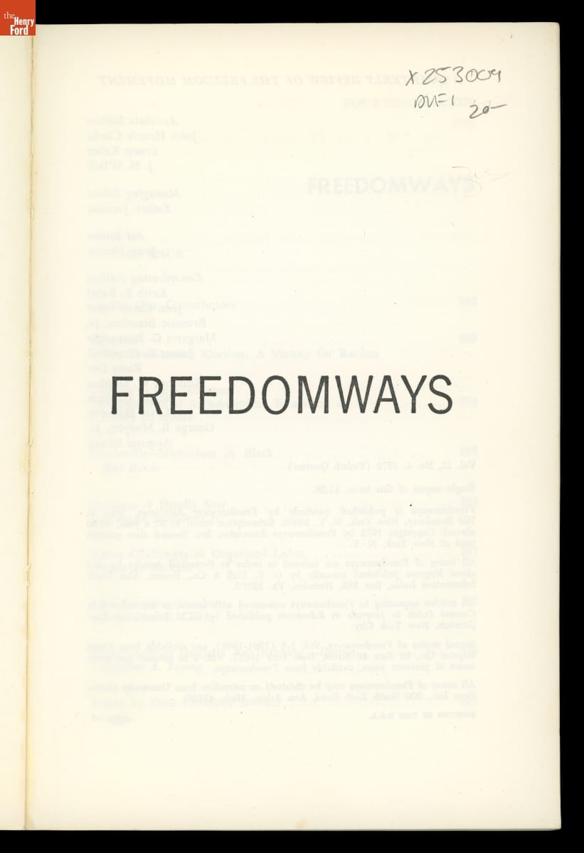 In 1961, Louis Burnham, Edward Strong, and W. E. B. Du Bois founded Freedomways, the leading African American theoretical, political, and cultural journal of its time. The journal included written works by leading Black authors, artists, politicians, and activists. The journal also reported on the political movements of the era, especially the American civil rights movement. Publication ceased in 1985.