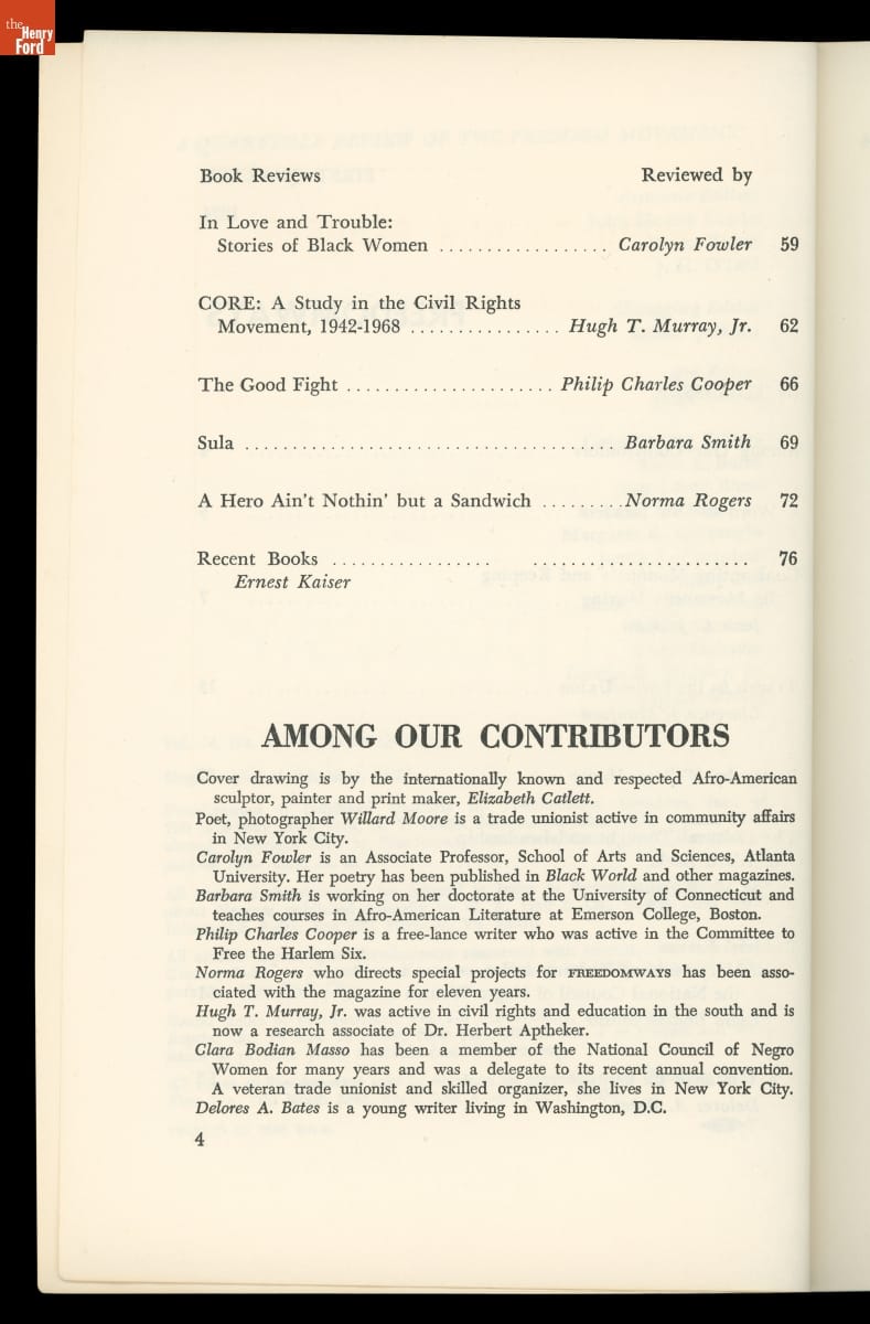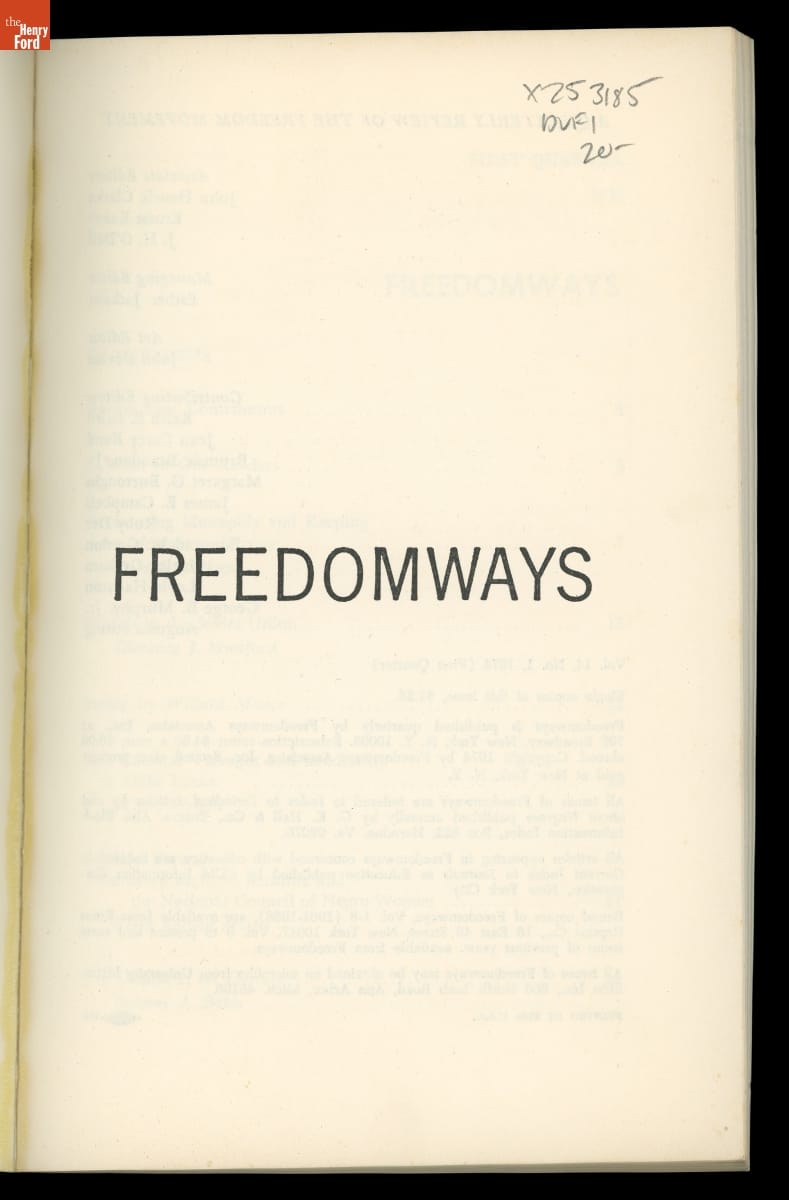 In 1961, Louis Burnham, Edward Strong, and W. E. B. Du Bois founded Freedomways, the leading African American theoretical, political, and cultural journal of its time. The journal included written works by leading Black authors, artists, politicians, and activists. The journal also reported on the political movements of the era, especially the American civil rights movement. Publication ceased in 1985.