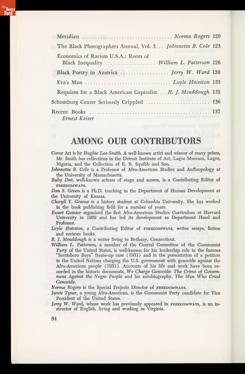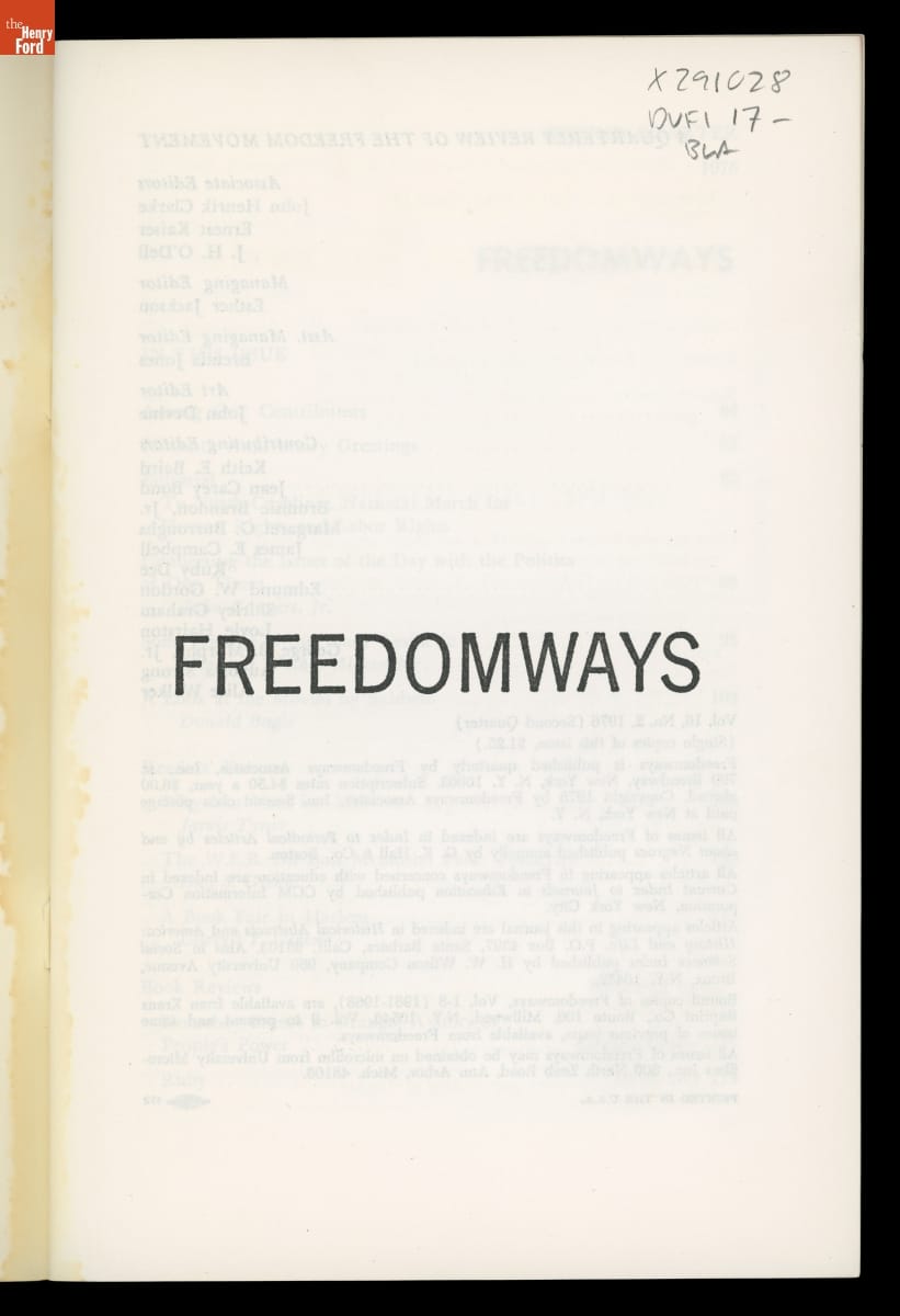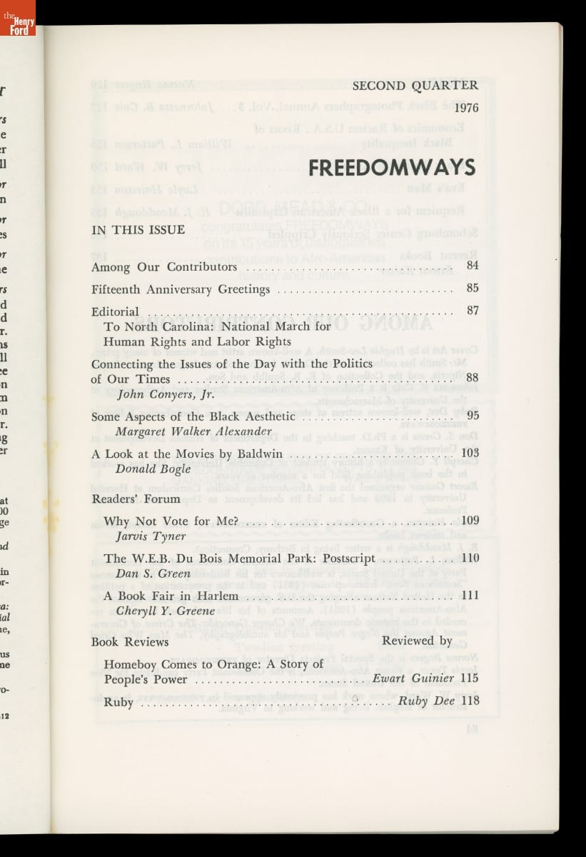 In 1961, Louis Burnham, Edward Strong, and W. E. B. Du Bois founded Freedomways, the leading African American theoretical, political, and cultural journal of its time. The journal included written works by leading Black authors, artists, politicians, and activists. The journal also reported on the political movements of the era, especially the American civil rights movement. Publication ceased in 1985.