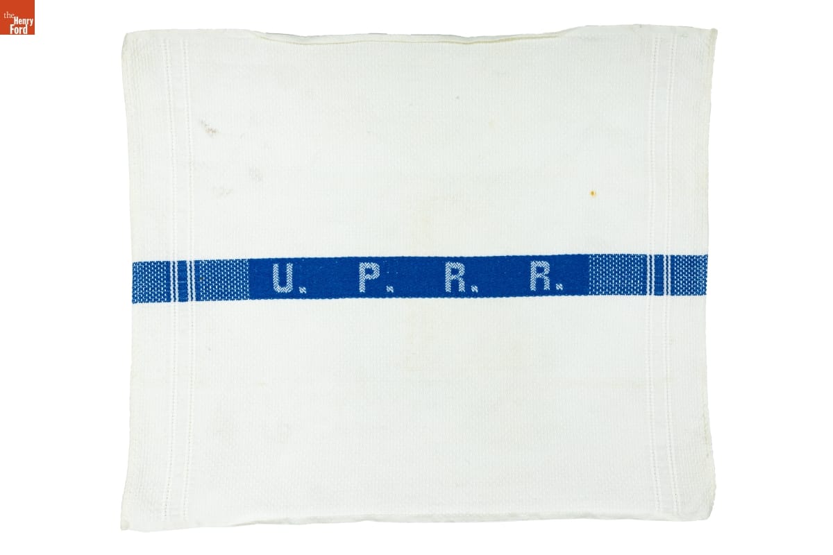 From its founding in 1867 until its demise a century later, Pullman was synonymous with first-class travel on American railroads. The company built sleeping cars and operated them under contract with host railroads. For Black Americans, jobs as Pullman porters offered a pathway into the middle class, though the work was difficult. This hand towel was used on Union Pacific trains.