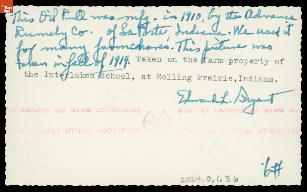 1910 Advance-Rumely Oil Pull Tractor Used at Interlaken School near Rolling Prairie, Indiana, 1914