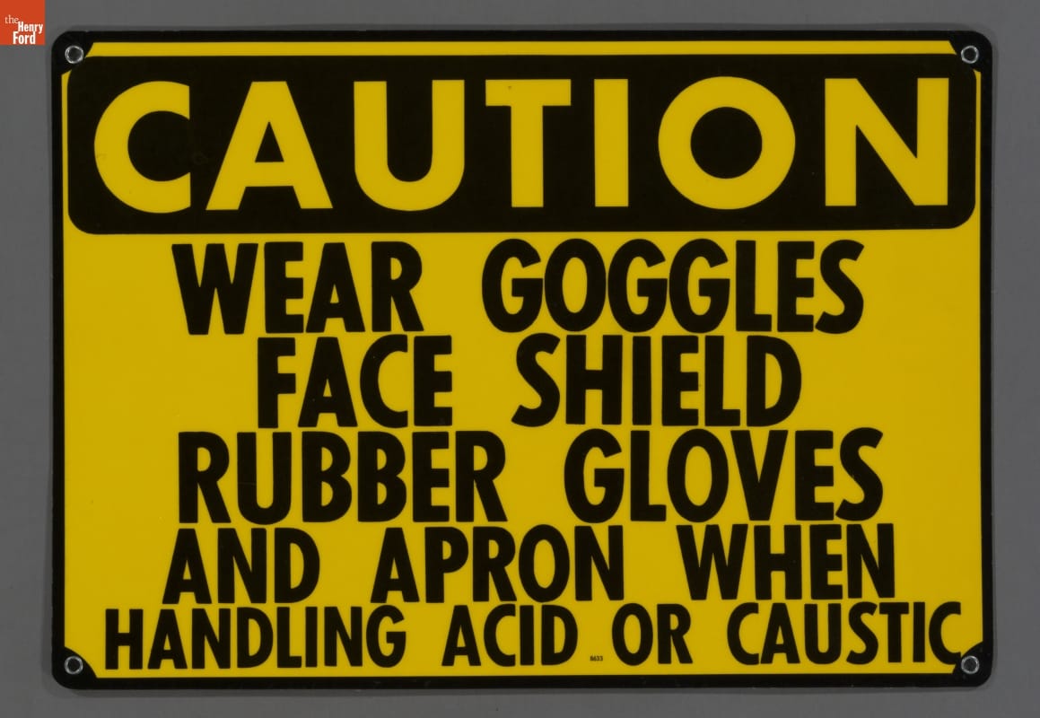 A safe workplace benefits both employees and employers. Warning signs alert workers of possible dangers that may cause harm -- and help prevent accidents and loss of valuable worktime. Signs, like this one from the 1990s, remind readers to use protective clothing and gear when working with hazardous materials.