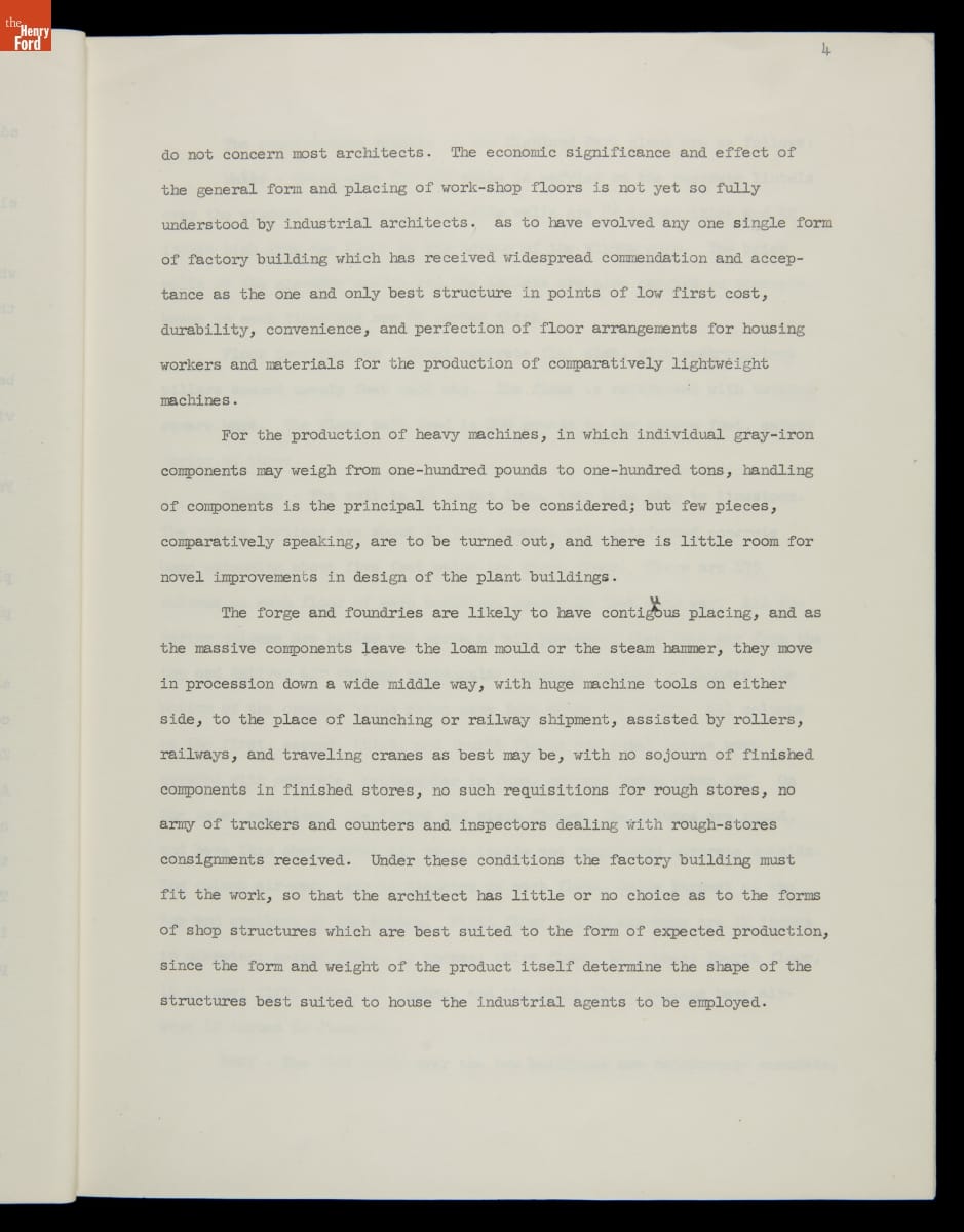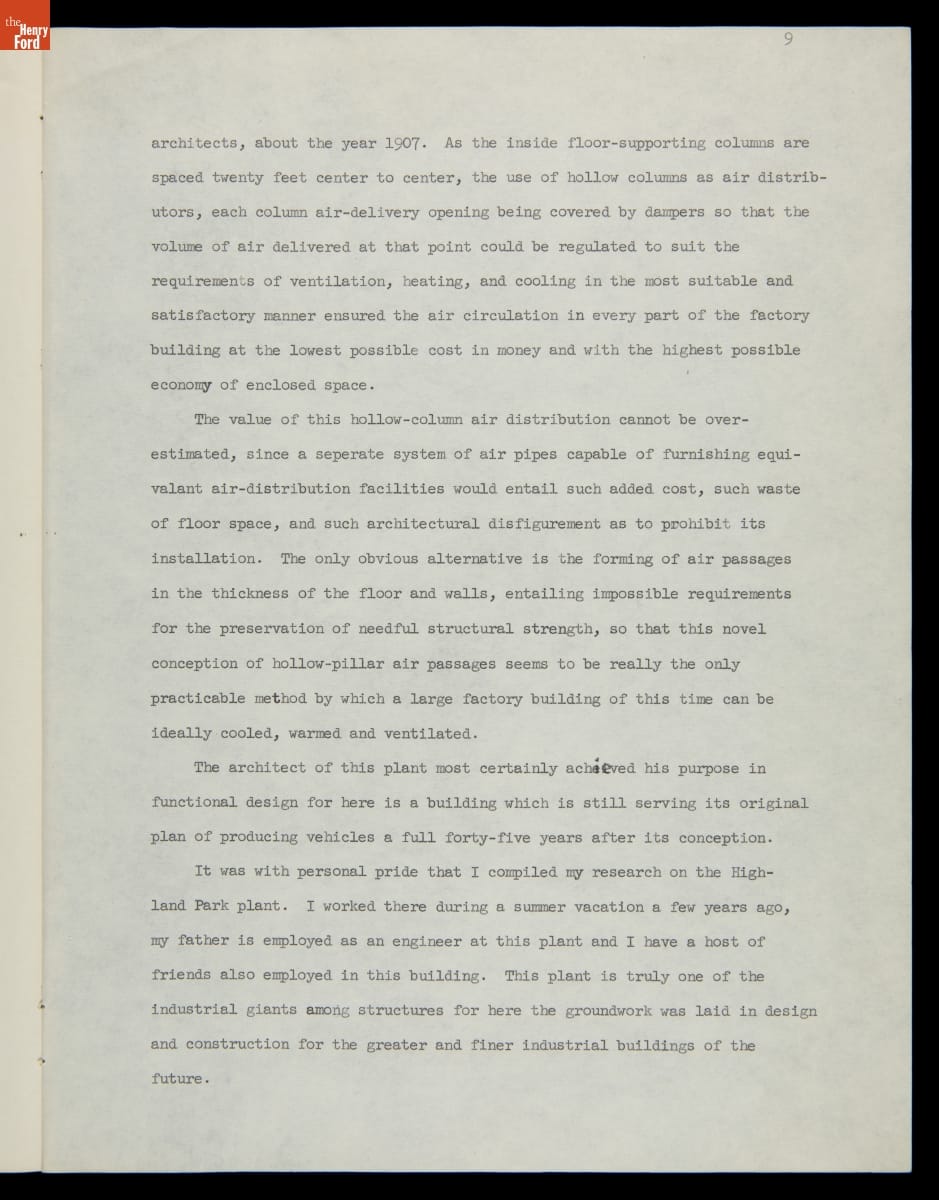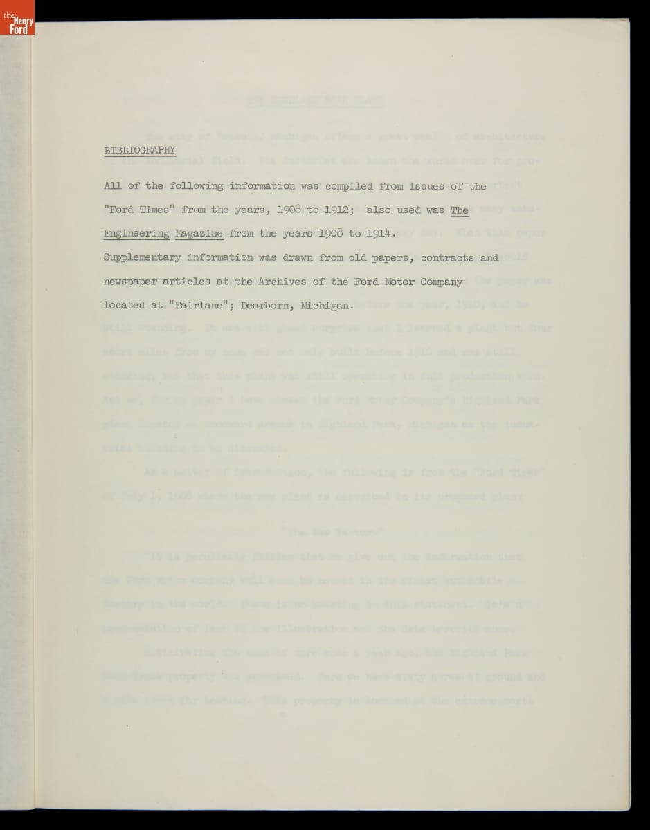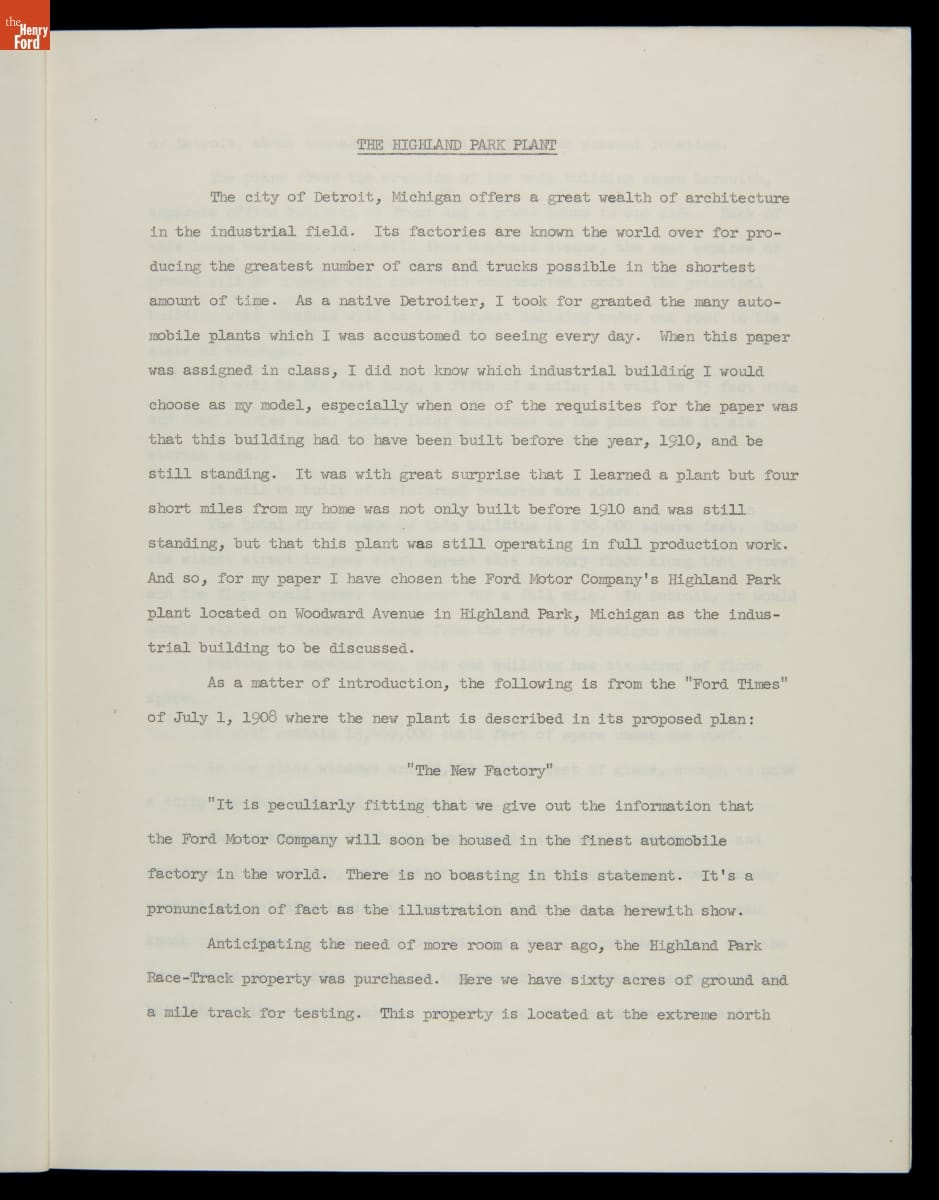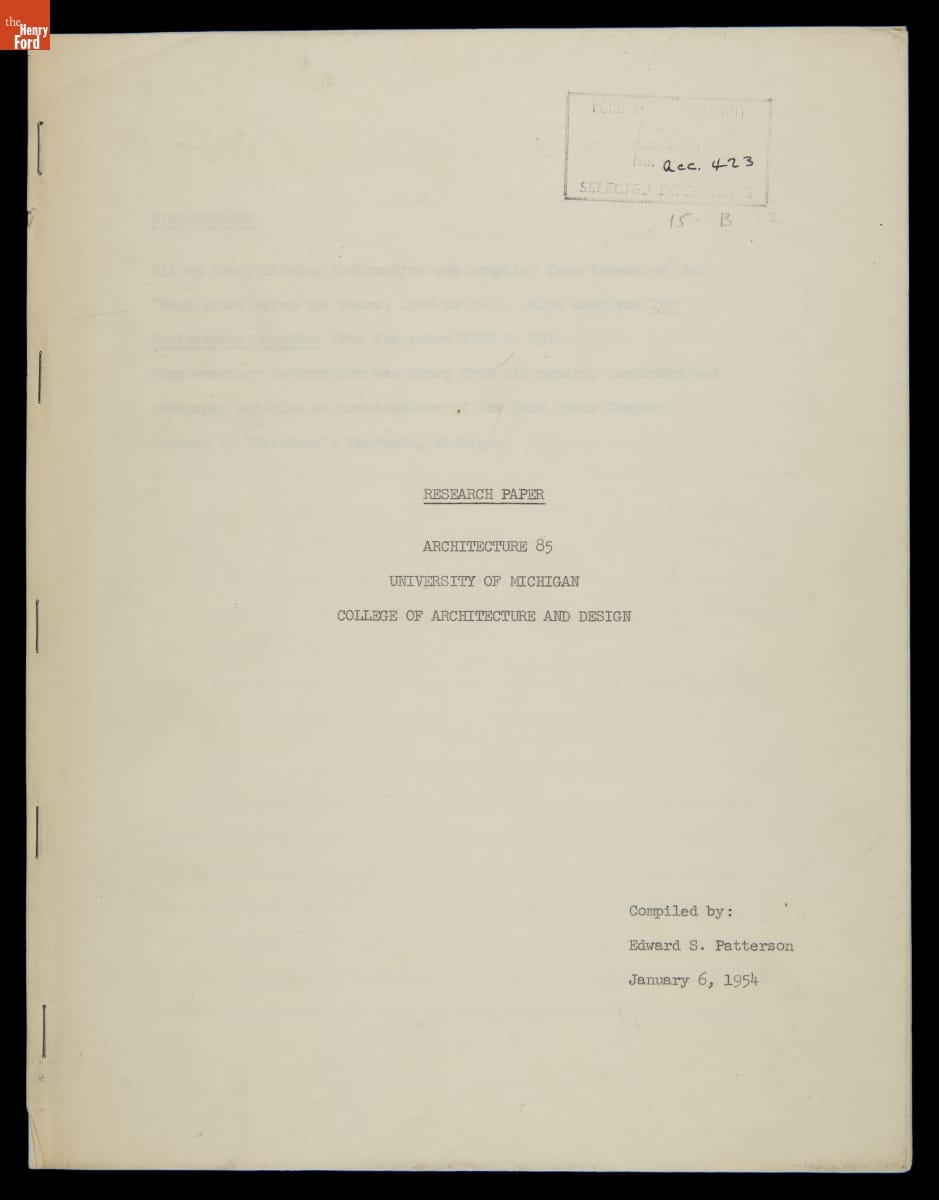 Edward S. Patterson, an architecture student at the University of Michigan, completed this research paper in 1954. His study focused on Ford Motor Company's Highland Park plant, where Ford developed its system of moving assembly and manufactured millions of Model T automobiles from 1910 to 1927. The factory's influence was enormous throughout the 20th century.