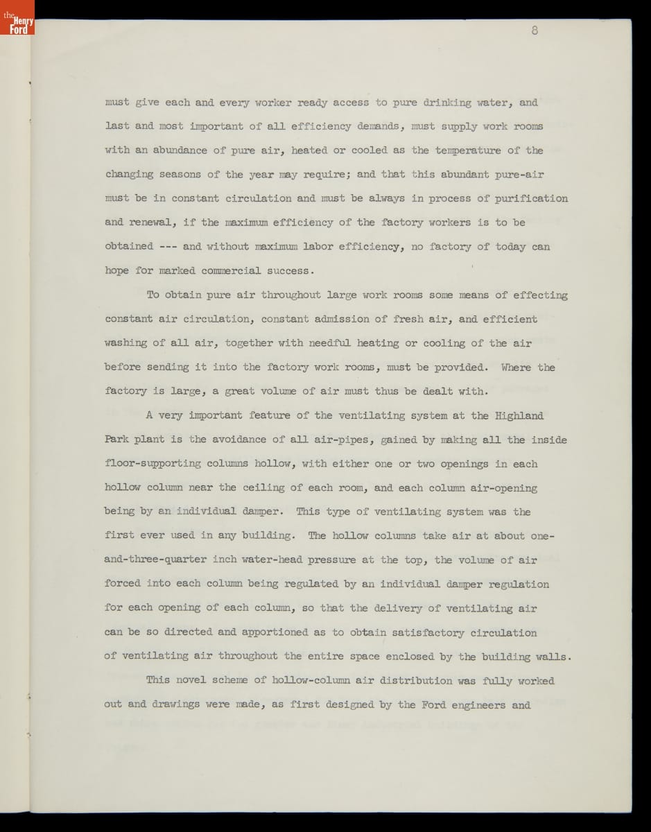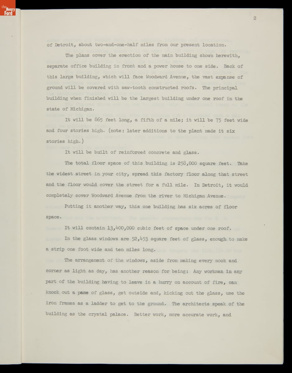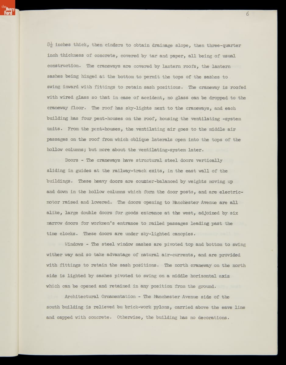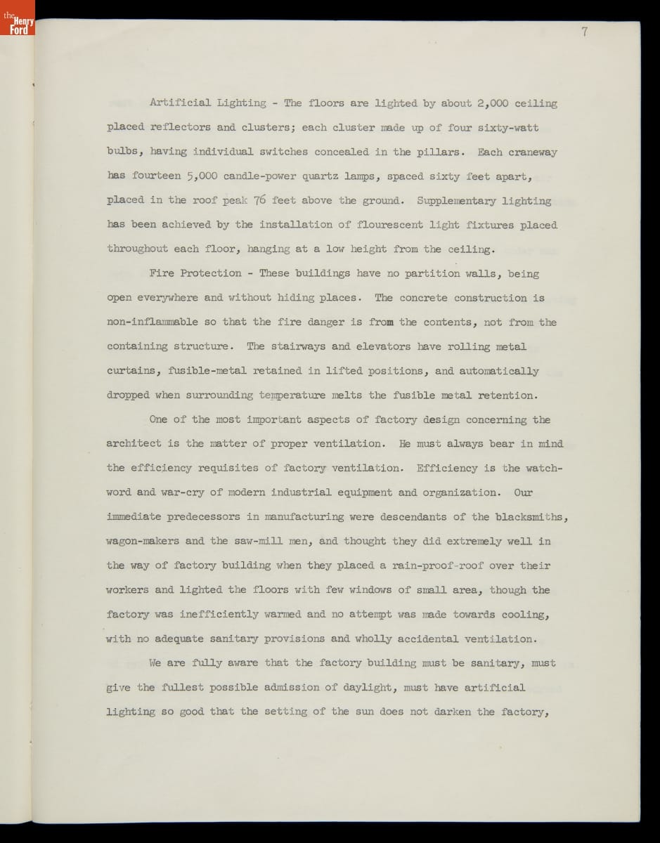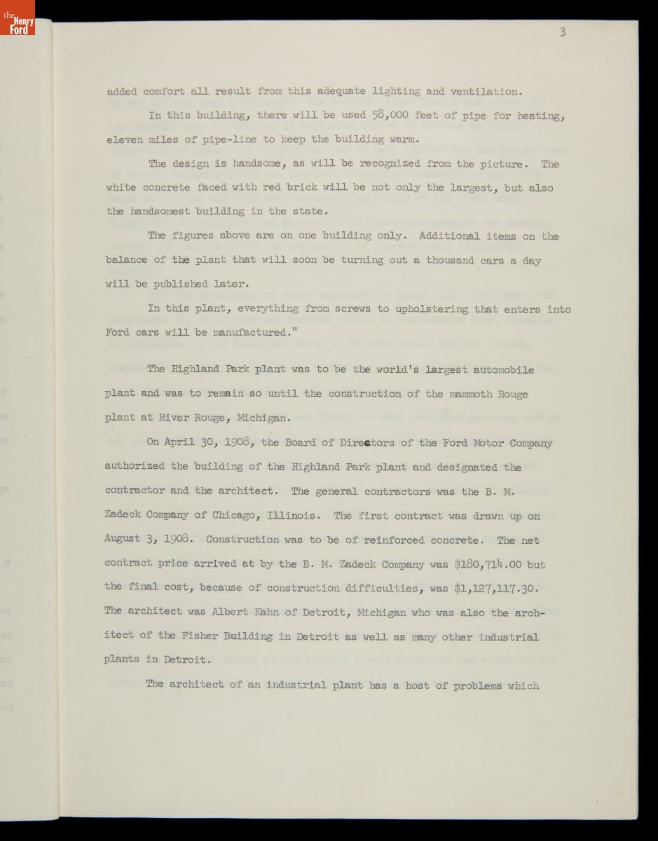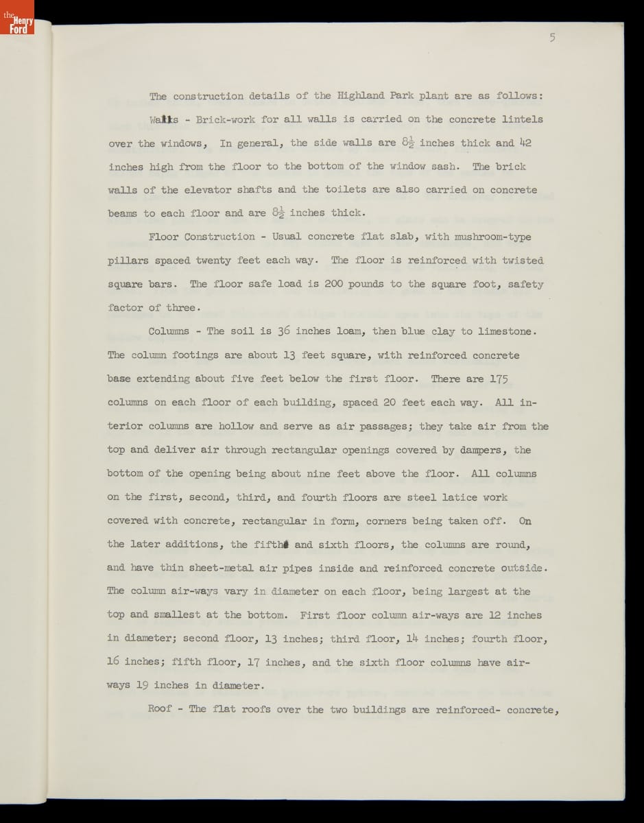 Edward S. Patterson, an architecture student at the University of Michigan, completed this research paper in 1954. His study focused on Ford Motor Company's Highland Park plant, where Ford developed its system of moving assembly and manufactured millions of Model T automobiles from 1910 to 1927. The factory's influence was enormous throughout the 20th century.