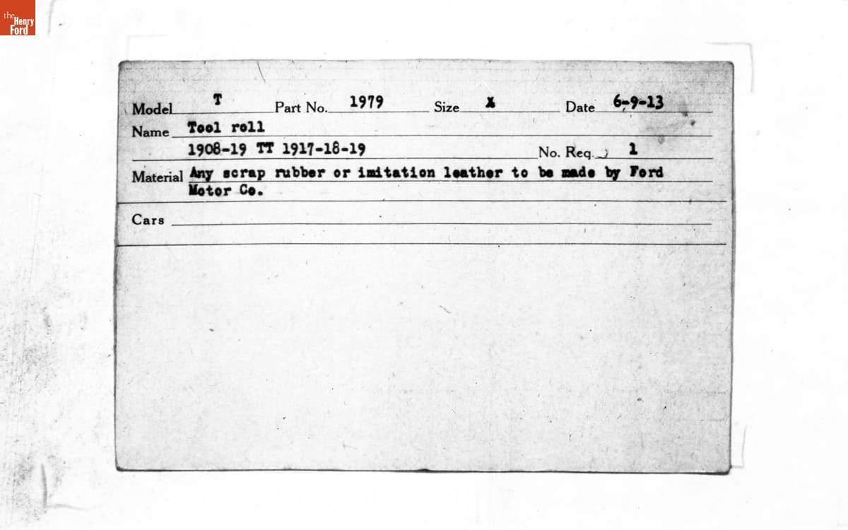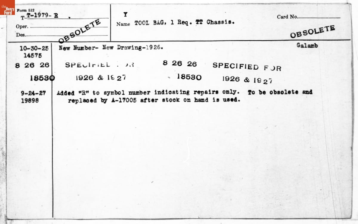Engineering Release Notes, Tool Roll or Tool Bag, Ford Model T, 1913-1927