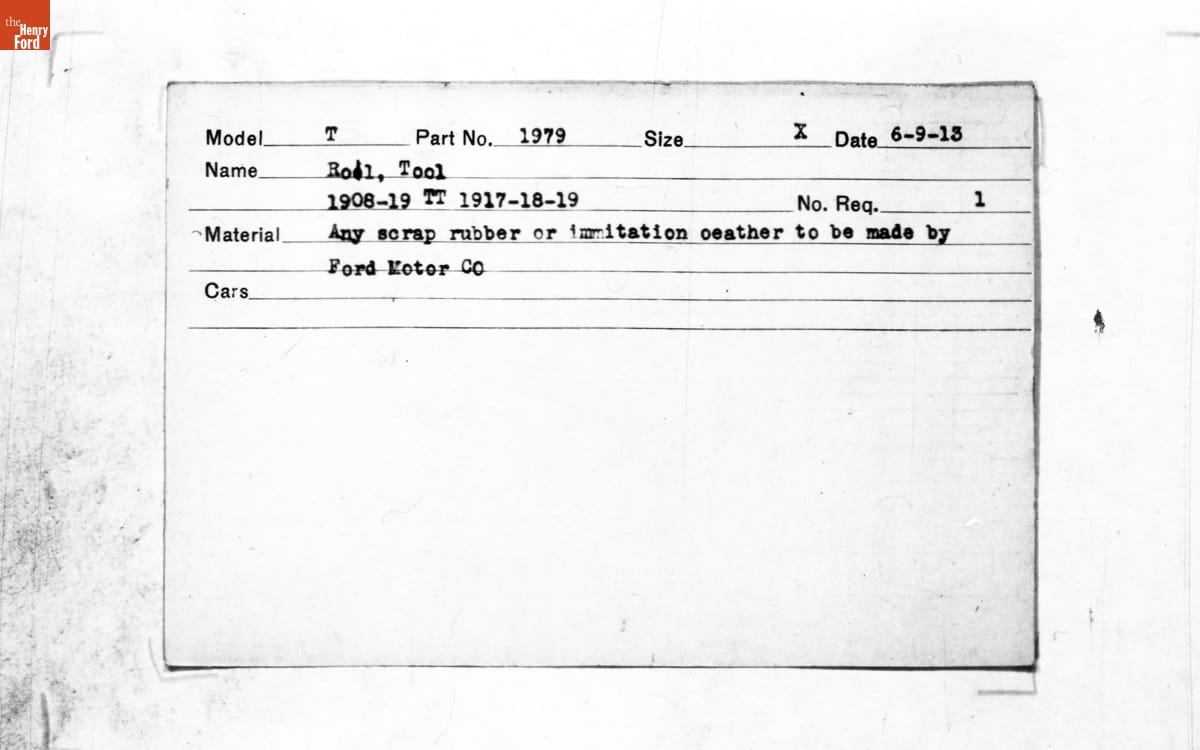 The Ford Motor Company created over a million parts drawings from 1903 to 1957. Many of these drawings specify engineering requirements for the components of Ford-made vehicles--including automobiles, trucks, tractors, military vehicles, and Tri-motor airplanes. Others provided information about assembly components, stages of casting and forging, or experimental designs. Beginning in the 1940s, Ford transferred the drawings and associated documents to microfilm.