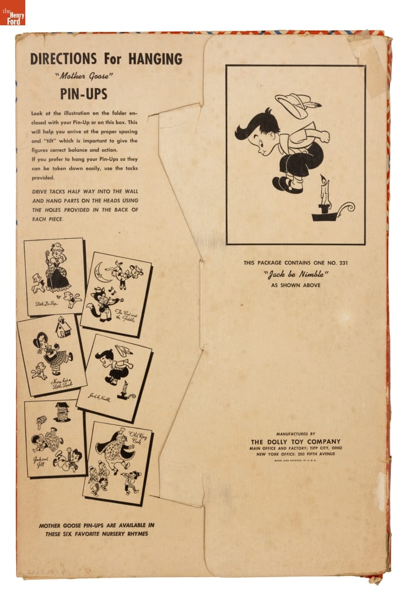 [...] / THIS PACKAGE CONTAINS ONE NO. 231 / "Jack Be Nimble" / AS SHOWN ABOVE / MANUFACTURED BY / THE DOLLY TOY COMPANY / MAIN OFFICE AND FACTORY, TIPP CITY, OHIO / NEW YORK OFFICE: 200 FIFTH AVENUE / MADE AND PRINTED IN U.S.A.