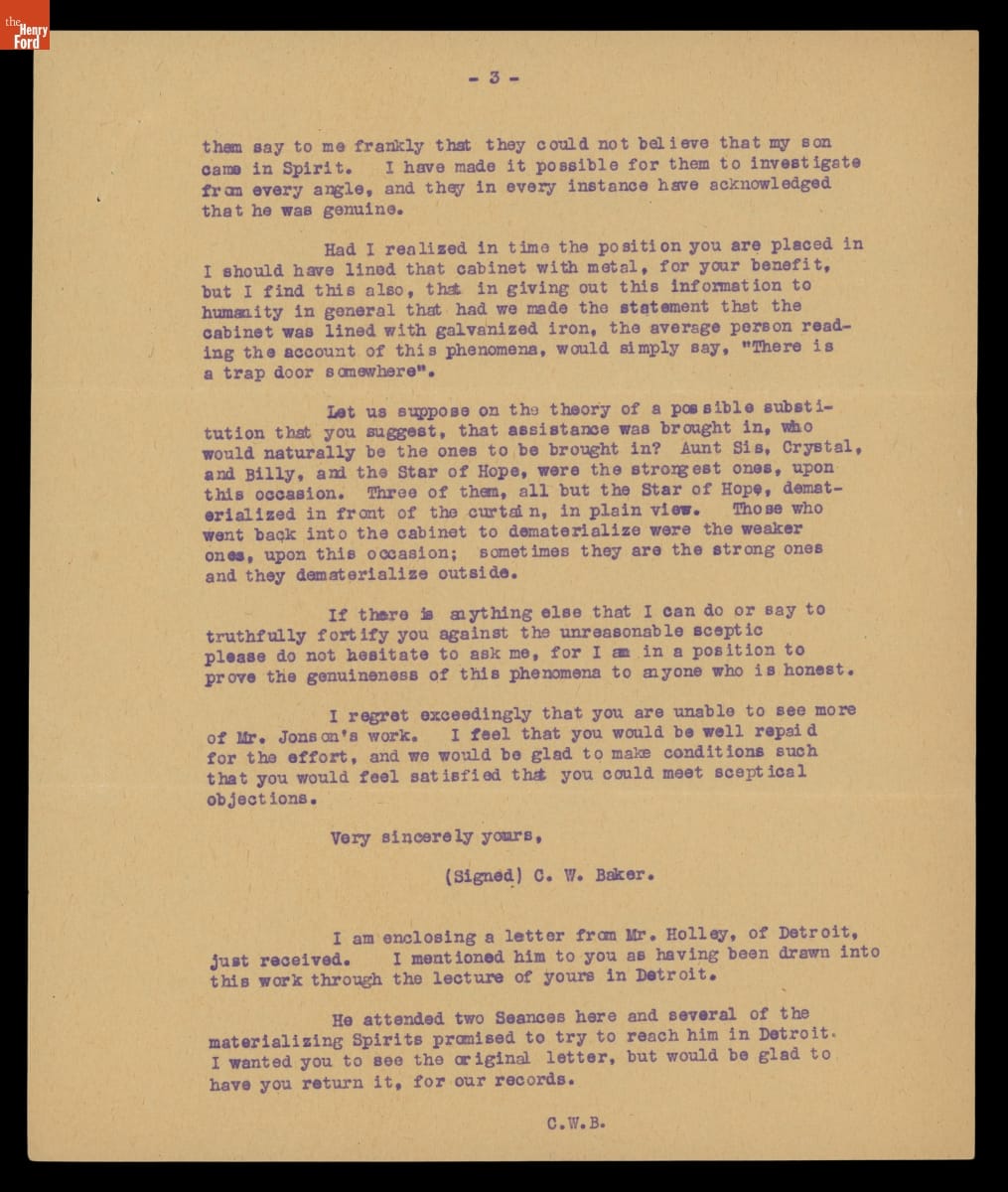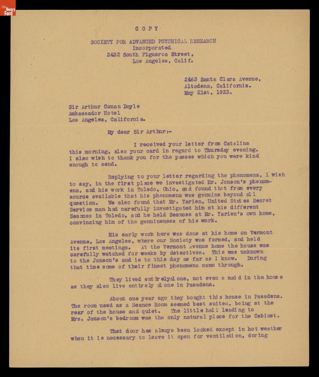 Letter from C.W. Baker of the Society for Advanced Psychical Research to Sir Arthur Conan Doyle, May 21, 1923