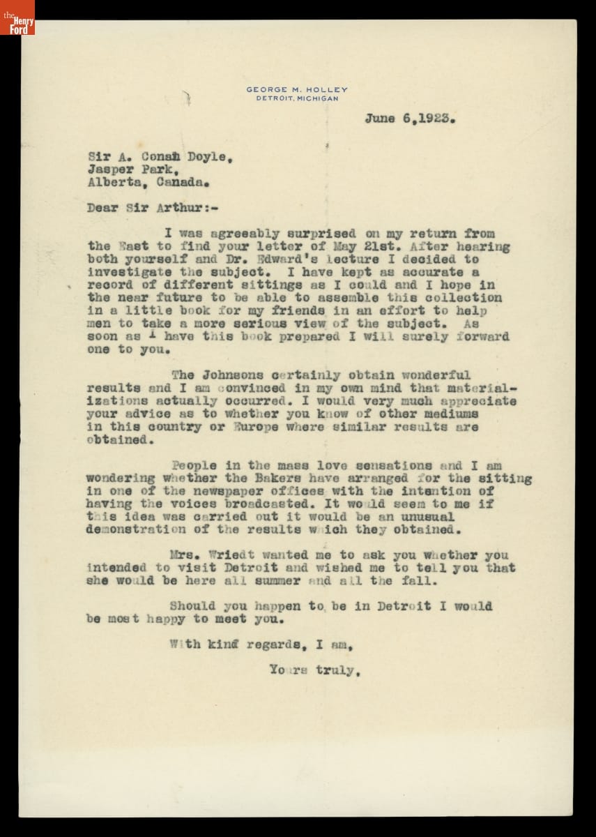 George Holley, founder of Holley Motor Company, and Sir Arthur Conan Doyle, famed author, became acquainted after Holley attended one of Doyle's lectures in Detroit. From 1923 to 1929, the two maintained a robust correspondence. Spiritualism was a frequent topic as they traded recommendations of mediums, bemoaned skeptics like Harry Houdini, and discussed the state of belief on both sides of the Atlantic.