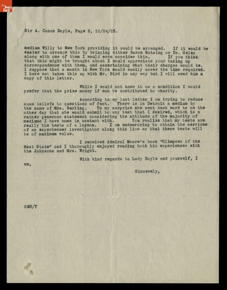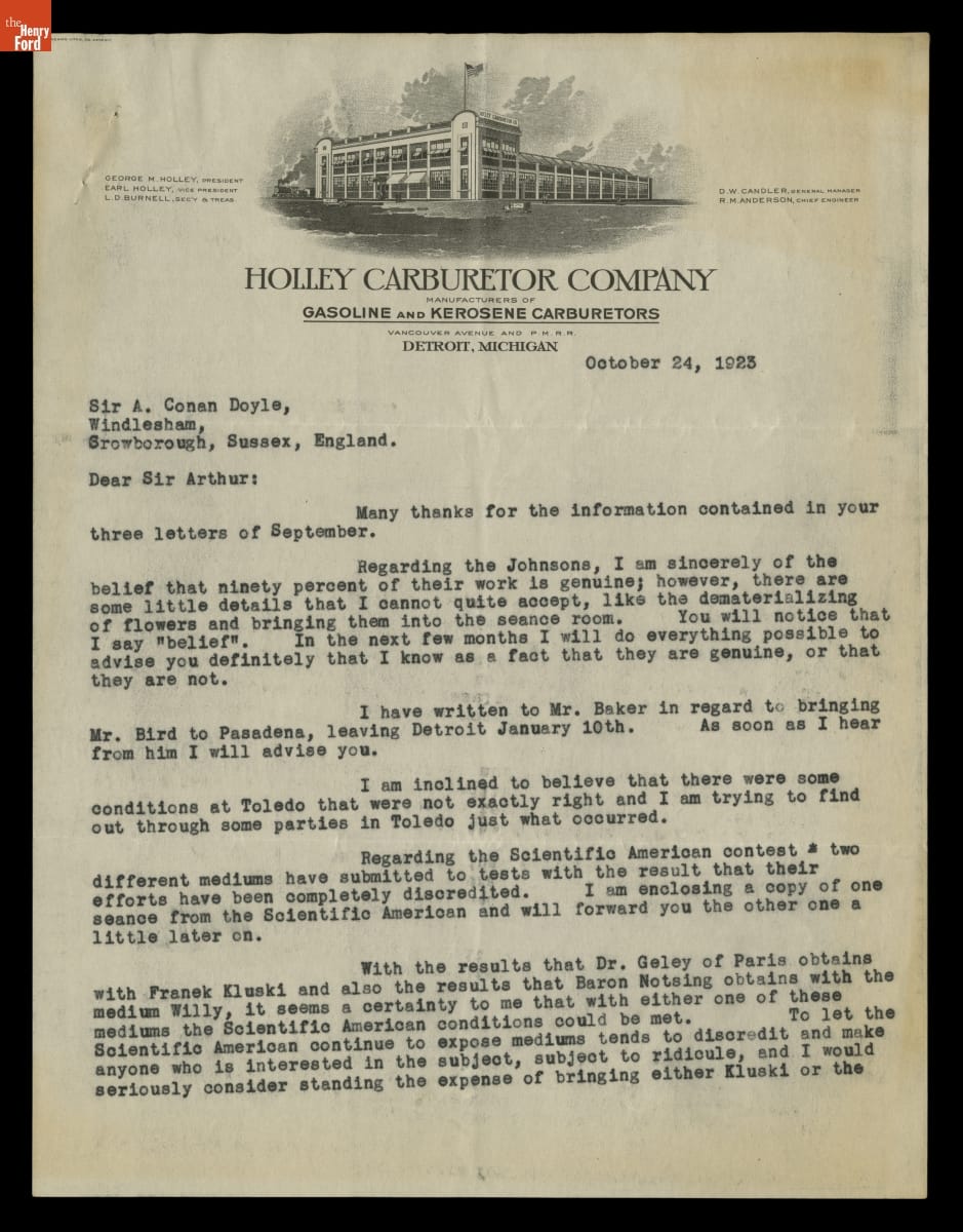 George Holley, founder of Holley Motor Company, and Sir Arthur Conan Doyle, famed author, became acquainted after Holley attended one of Doyle's lectures in Detroit. From 1923 to 1929, the two maintained a robust correspondence. Spiritualism was a frequent topic as they traded recommendations of mediums, bemoaned skeptics like Harry Houdini, and discussed the state of belief on both sides of the Atlantic.
