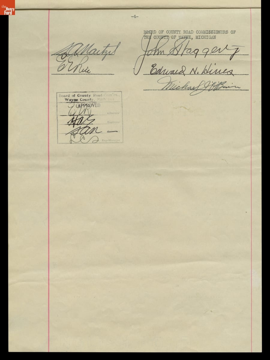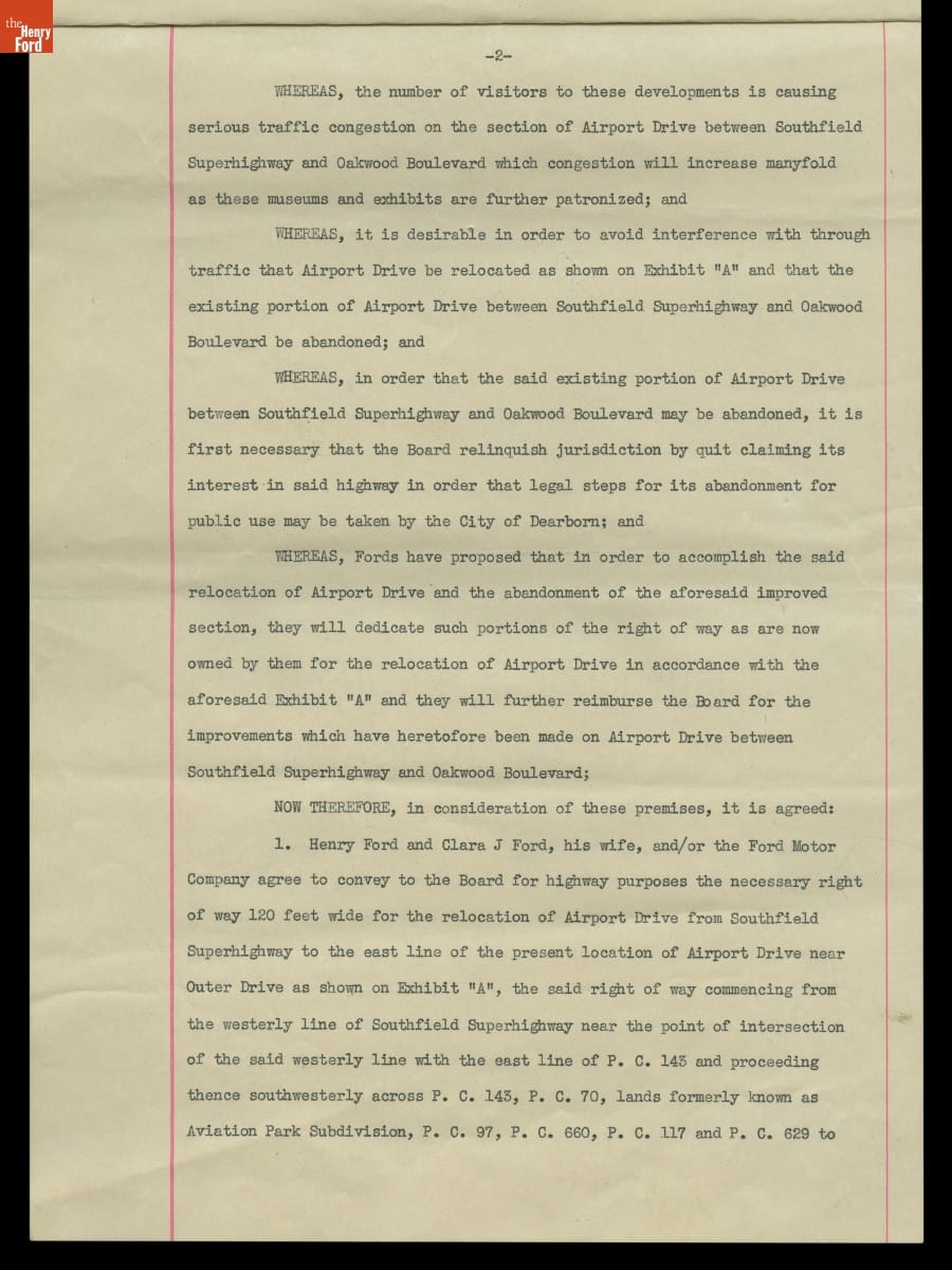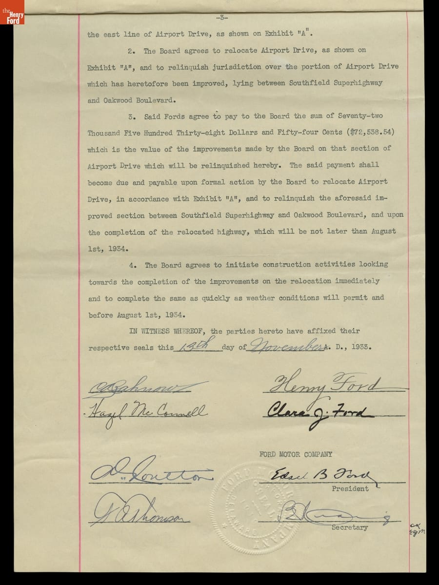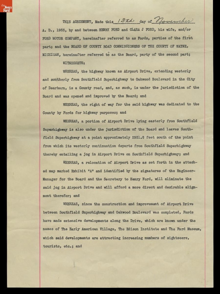 Map and Agreement concerning Relocating "Airport Road" through Henry Ford's Property in Dearborn Township, 1933