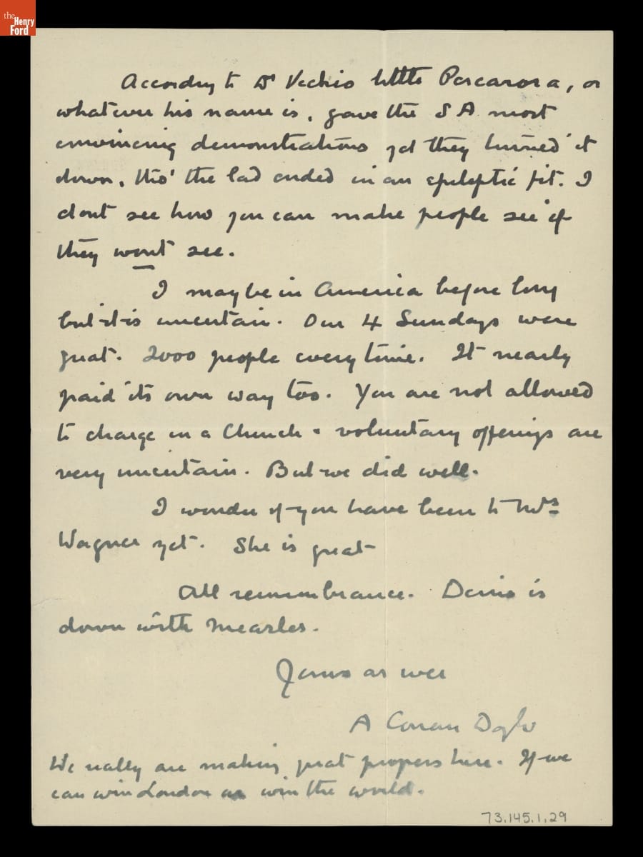 George Holley, founder of Holley Motor Company, and Sir Arthur Conan Doyle, famed author, became acquainted after Holley attended one of Doyle's lectures in Detroit. From 1923 to 1929, the two maintained a robust correspondence. Spiritualism was a frequent topic as they traded recommendations of mediums, bemoaned skeptics like Harry Houdini, and discussed the state of belief on both sides of the Atlantic.