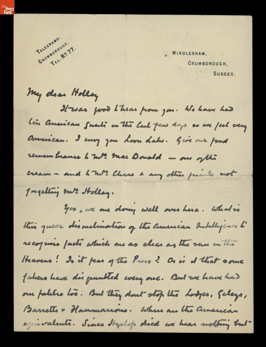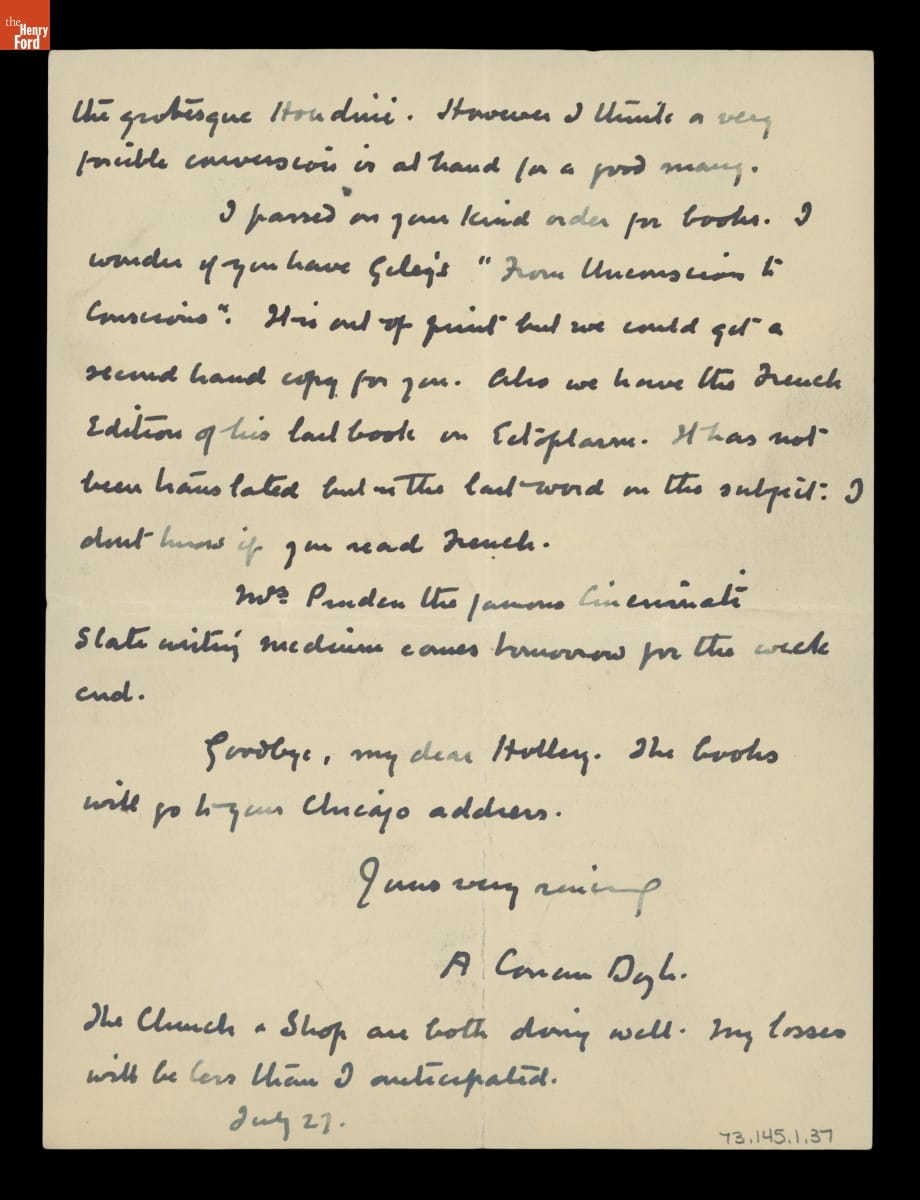 George Holley, founder of Holley Motor Company, and Sir Arthur Conan Doyle, famed author, became acquainted after Holley attended one of Doyle's lectures in Detroit. From 1923 to 1929, the two maintained a robust correspondence. Spiritualism was a frequent topic as they traded recommendations of mediums, bemoaned skeptics like Harry Houdini, and discussed the state of belief on both sides of the Atlantic.
