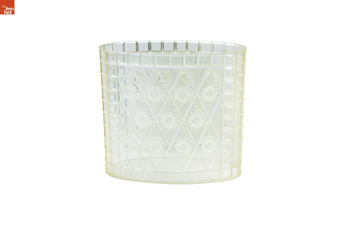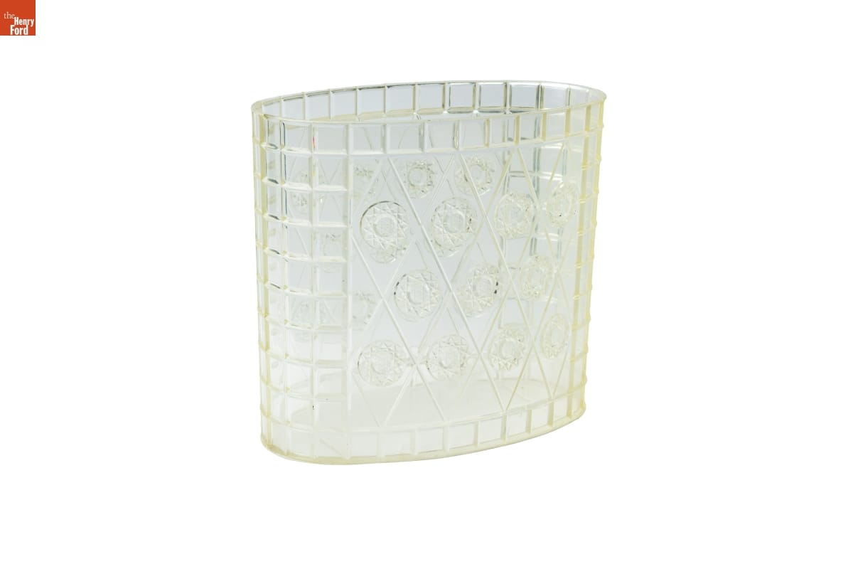 This wastebasket from the early 1960s blends traditional and modern styles into a simple and functional household item. The star-and-circle-molded, clear plastic cover rejects the bold colors designs popular in high-style interiors -- perfect for an upper middle-class home.