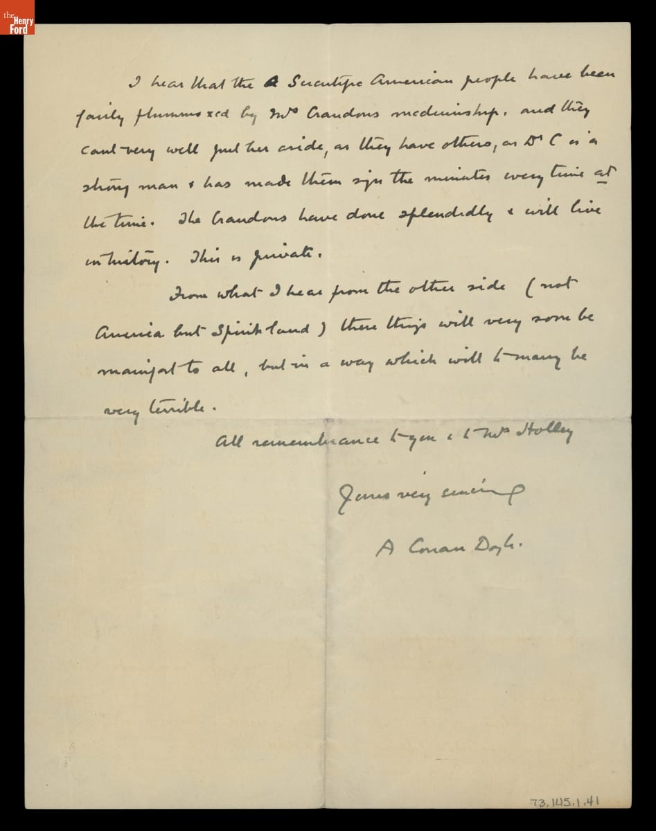 George Holley, founder of Holley Motor Company, and Sir Arthur Conan Doyle, famed author, became acquainted after Holley attended one of Doyle's lectures in Detroit. From 1923 to 1929, the two maintained a robust correspondence. Spiritualism was a frequent topic as they traded recommendations of mediums, bemoaned skeptics like Harry Houdini, and discussed the state of belief on both sides of the Atlantic.