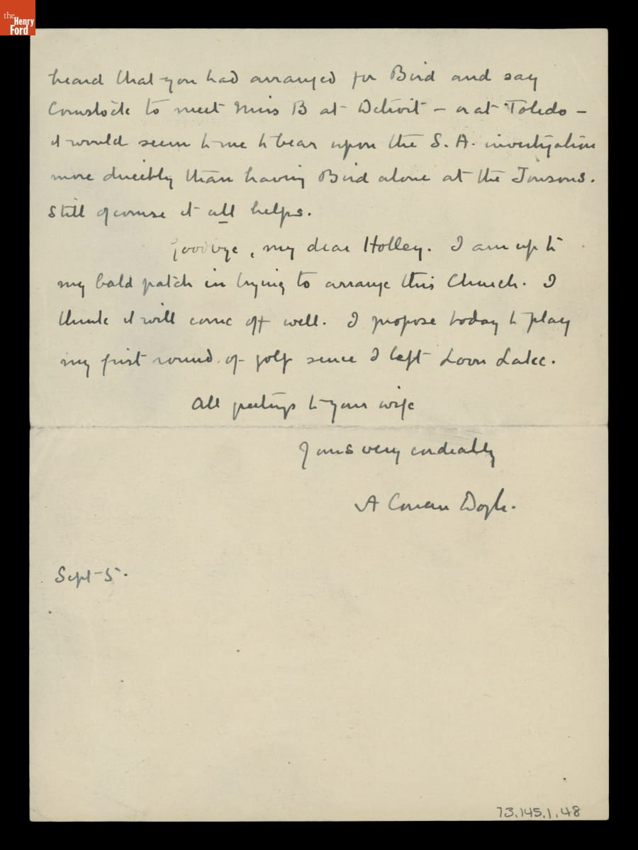 Letter from Arthur Conan Doyle to George M. Holley, September 5, 1923