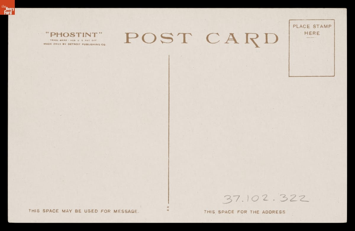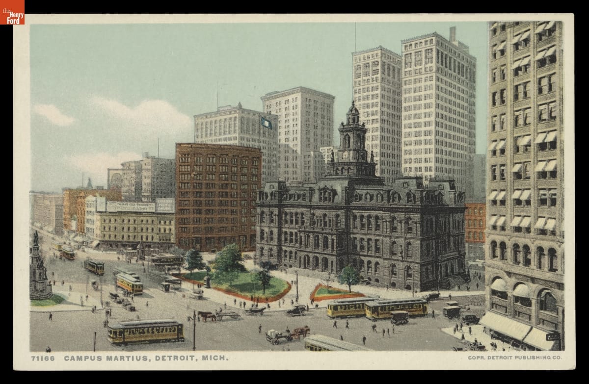 Campus Martius in Detroit, Michigan, was a former military training ground that became the "point of origin" of the city's coordinate street system and the site of the Michigan Soldiers' and Sailors' Monument (seen on the left). This postcard shows the many ways people moved around Detroit in the early 1910s: by walking, streetcars, horse-drawn wagons, and automobiles.