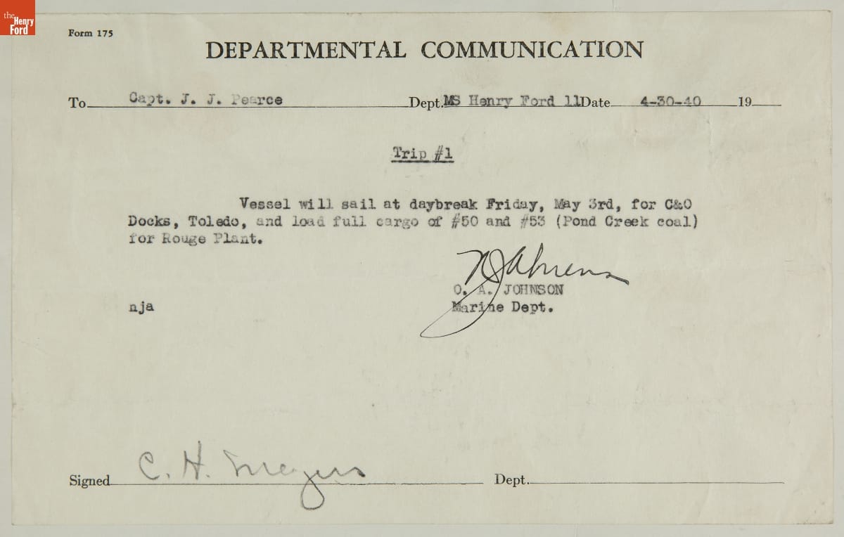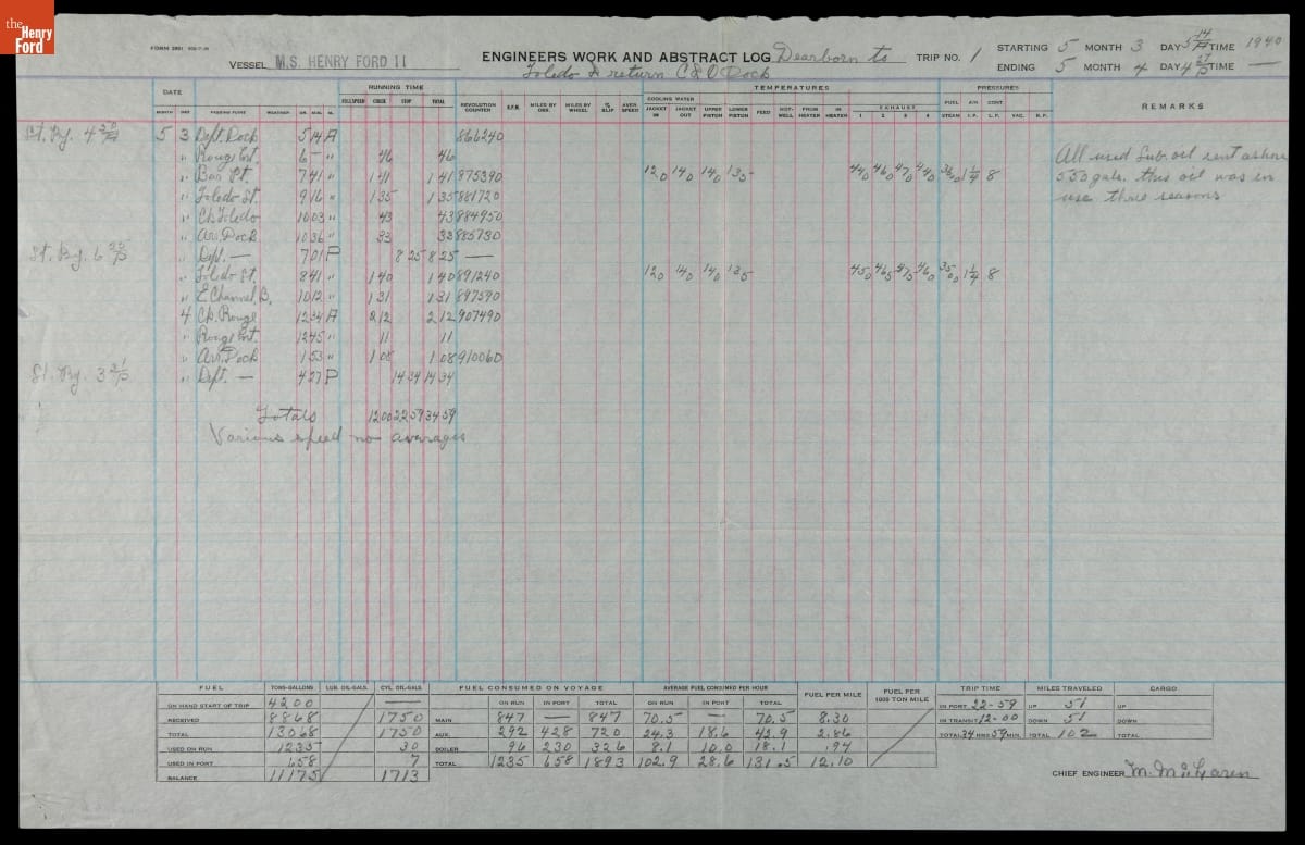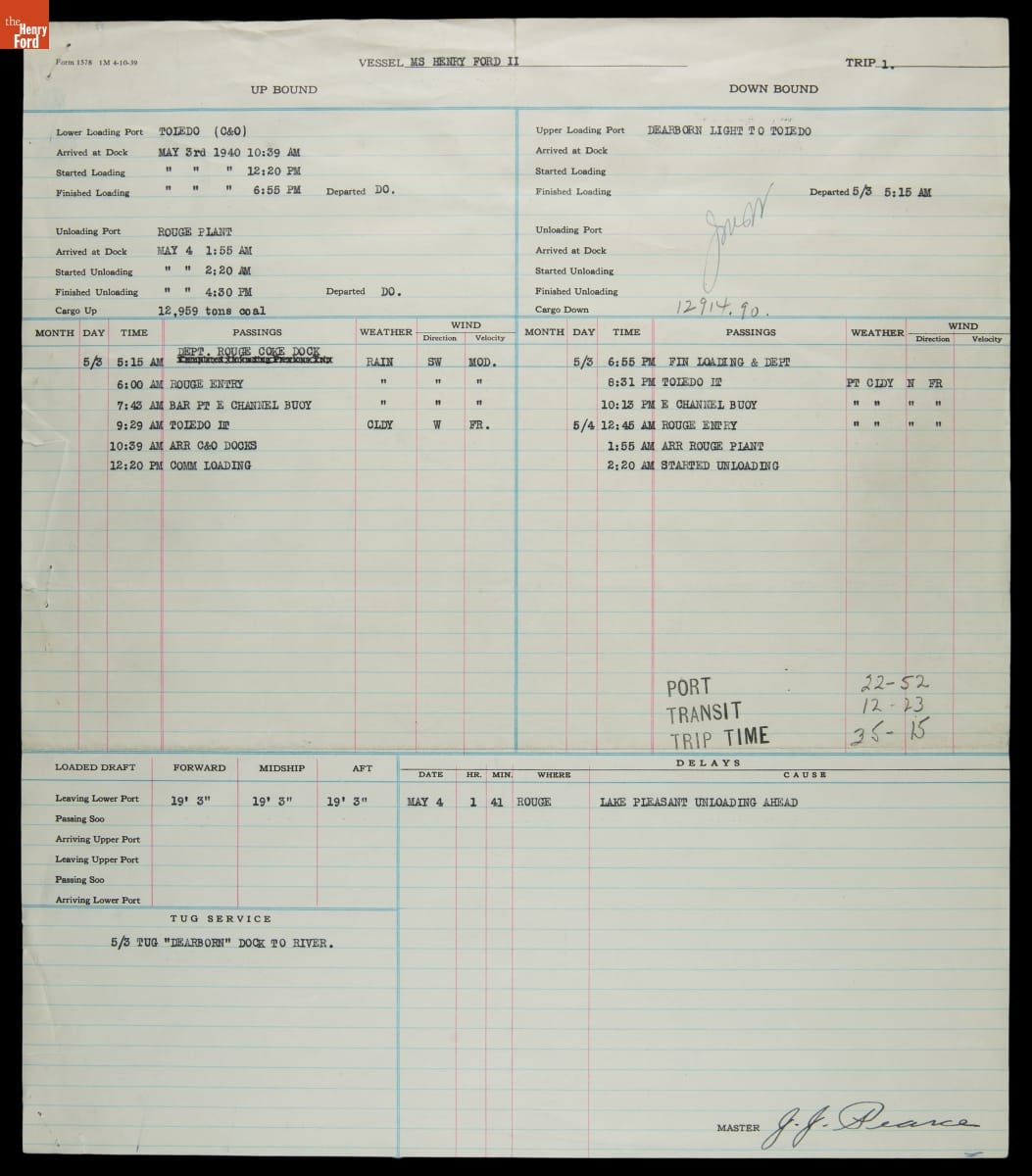 Henry Ford had two ore freighters built in 1924 and named them after his grandsons -- Henry Ford II and Benson Ford. The ships plied the Great Lakes, transporting raw materials and finished products to and from Ford's River Rouge manufacturing complex. A ship's log kept record of the cargo, loading and unloading ports, sailing dates, general weather conditions, and reasons for delay.
