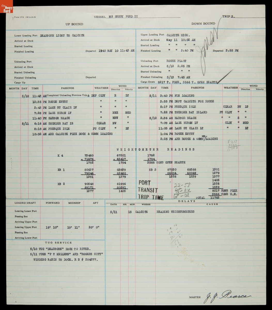 Henry Ford had two ore freighters built in 1924 and named them after his grandsons -- Henry Ford II and Benson Ford. The ships plied the Great Lakes, transporting raw materials and finished products to and from Ford's River Rouge manufacturing complex. A ship's log kept record of the cargo, loading and unloading ports, sailing dates, general weather conditions, and reasons for delay.