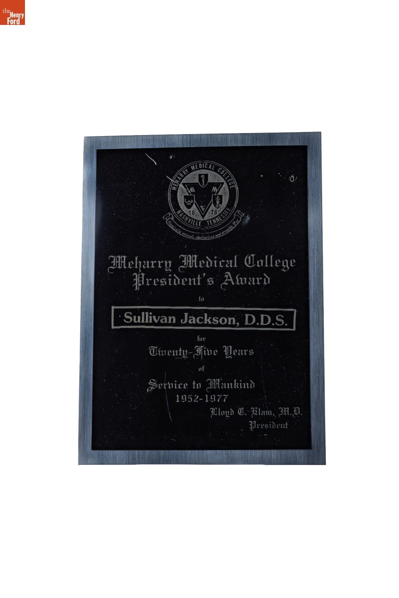 [college seal] / Meharry Medical College / President's Award / to / Sullivan Jackson, D.D.S. / for / Twenty-Five Years / of / Service to Mankind / 1952-1977 / Lloyd C. Elam, M.D. / President
