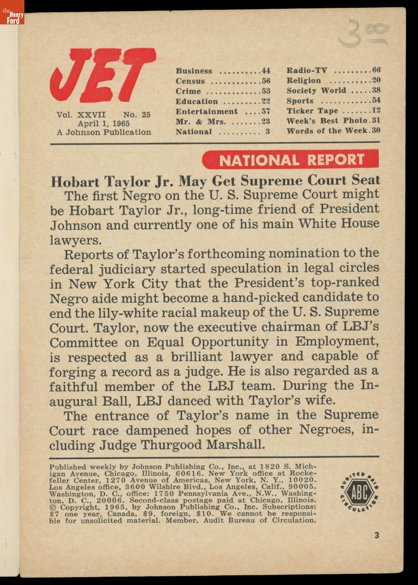 John H. Johnson, head of the Chicago-based Johnson Publishing Company, founded Jet magazine in November 1951. Originally billed as "The Weekly Negro News Magazine," the publication printed news, culture, and entertainment articles related to the African American community. Jet also chronicled the civil rights movement from its earliest years, addressing racial violence and inequality in American society.