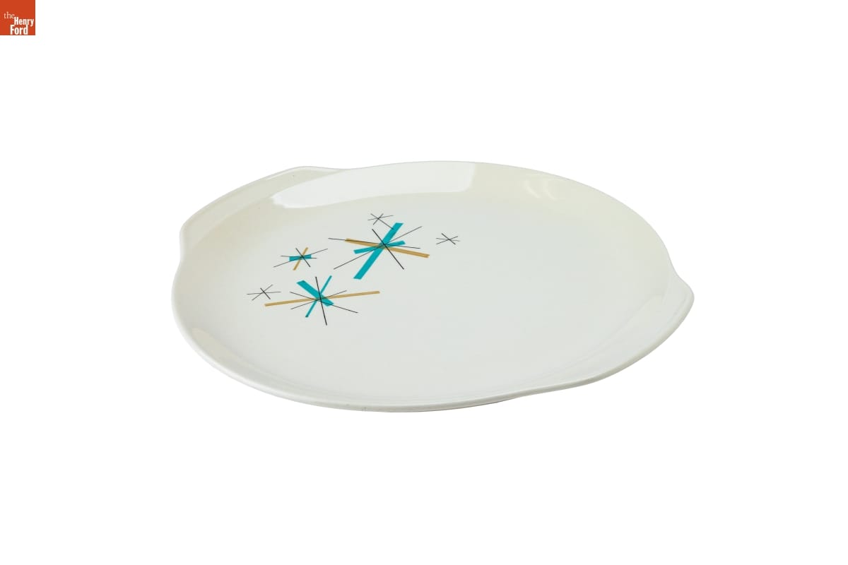Industrial designer Victor Schreckengost created "Hopscotch" pattern dinnerware for the Salem China Company in the mid-1950s. Though fashionable, it was expensive to produce, and sales lagged. The Ohio-based company simplified the design and renamed it "North Star." Sold from 1957 to 1967 in retail stores and wholesaled to supermarket chains as a promotional item, "North Star" is emblematic of modern middle-class tastes of the time.