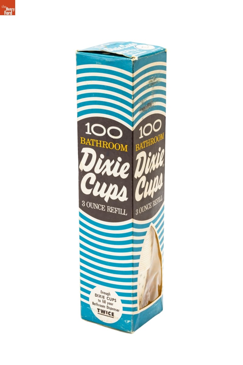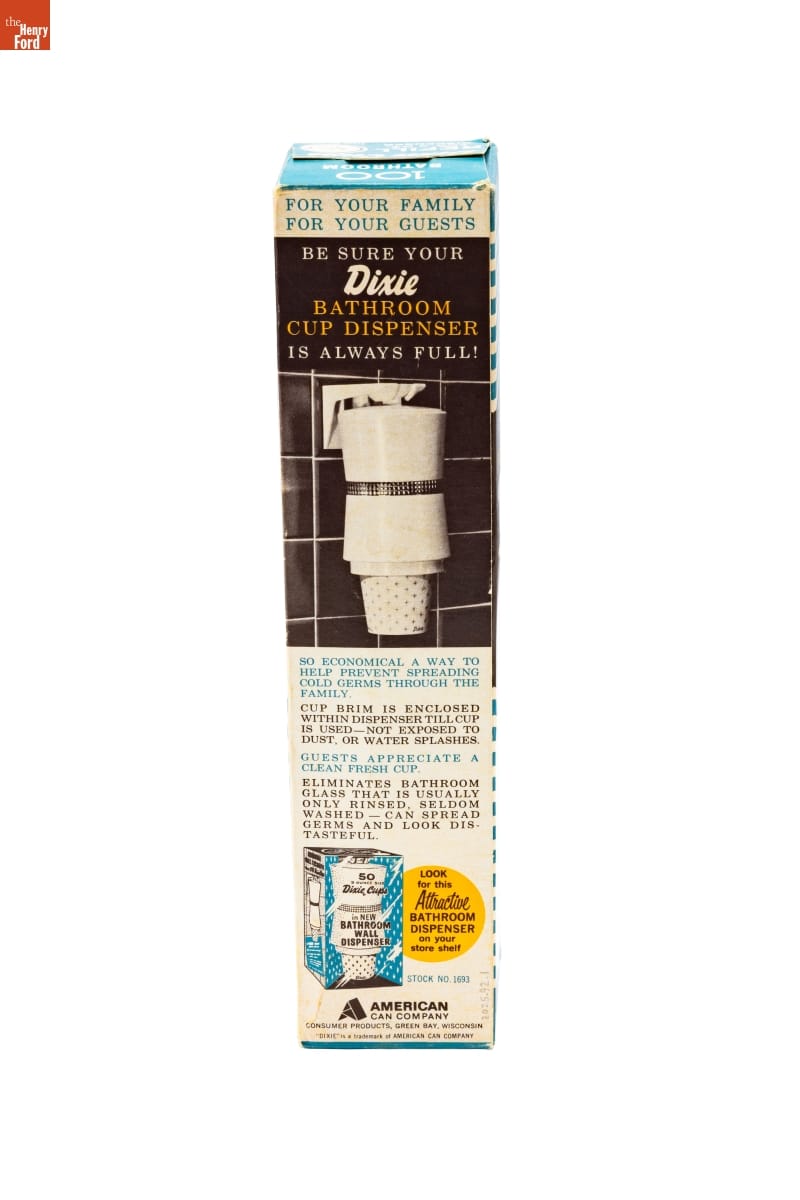 FOR YOUR FAMILY / FOR YOUR GUESTS / BE SURE YOUR / Dixie / BATHROOM / CUP DISPENSER / IS ALWAYS FULL! / [...] / AMERICAN / CAN COMPANY / CONSUMER PRODUCTS, GREEN BAY, WISCONSIN / "DIXIE" is a trademark of AMERICAN CAN COMPANY