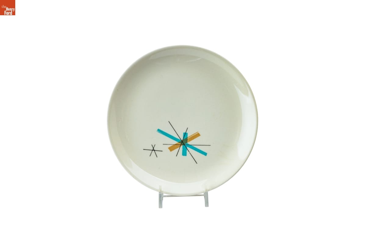 Industrial designer Victor Schreckengost created "Hopscotch" pattern dinnerware for the Salem China Company in the mid-1950s. Though fashionable, it was expensive to produce, and sales lagged. The Ohio-based company simplified the design and renamed it "North Star." Sold from 1957 to 1967 in retail stores and wholesaled to supermarket chains as a promotional item, "North Star" is emblematic of modern middle-class tastes of the time.