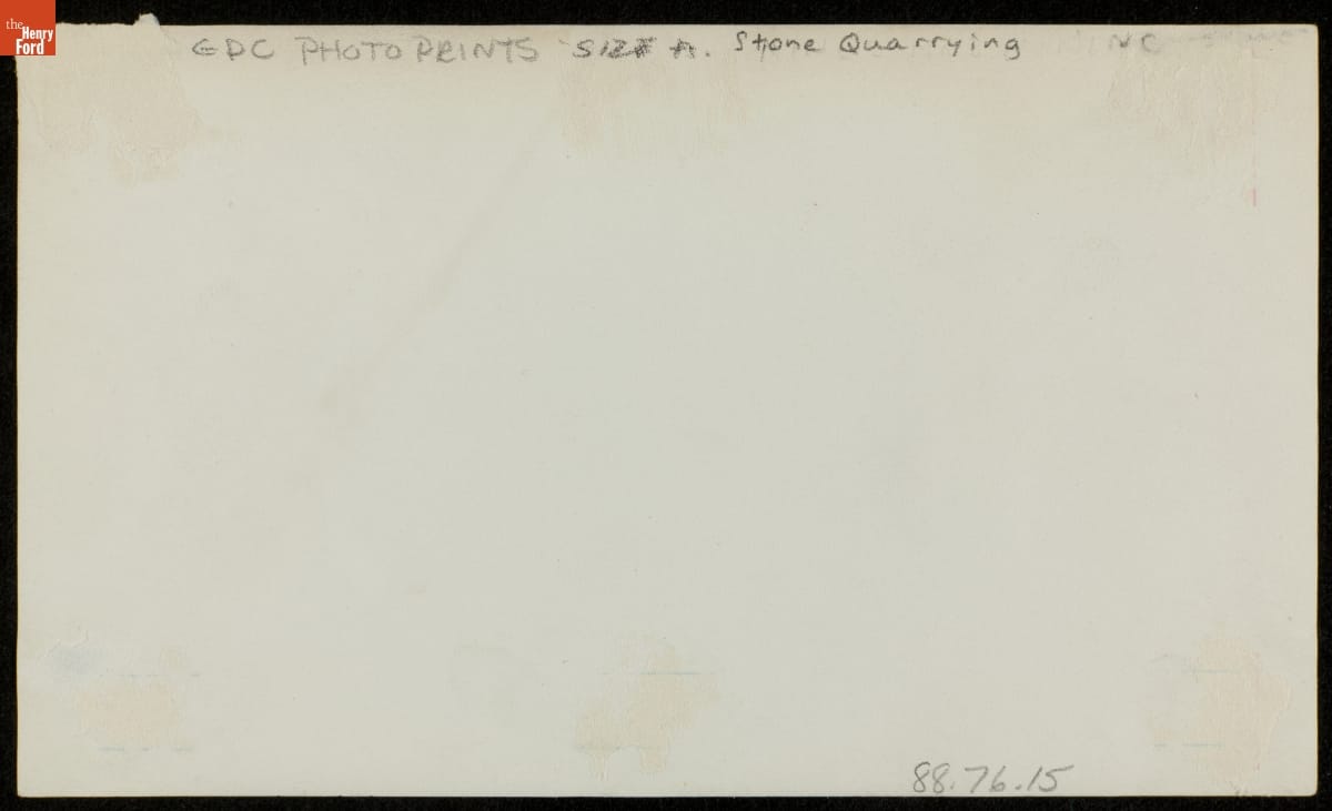 Before it fell, the hoist pictured here would have helped workers lift and transport material taken from this unidentified quarry. The photograph was clipped from a scrapbook owned by Detroit Edison electric utility's Photographic Department. Subjects included quarries, lumbering operations, railroad building, electric power stations, and waterways throughout the state of Michigan.