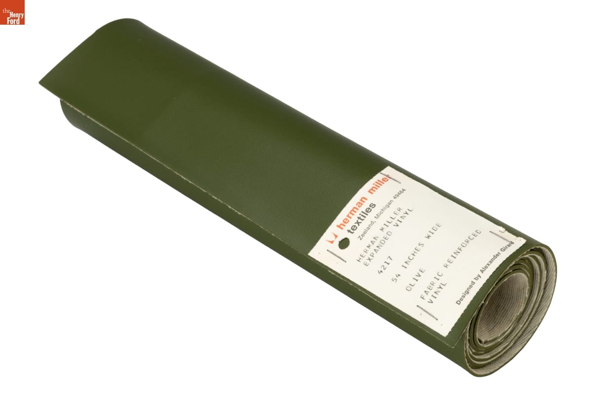 herman miller / textiles / Zeeland, Michigan 49464 / HERMAN MILLER / EXPANDED VINYL / 4217 / 54 INCHES WIDE / OLIVE / FABRIC REINFORCED / VINYL / Designed by Alexander Girard