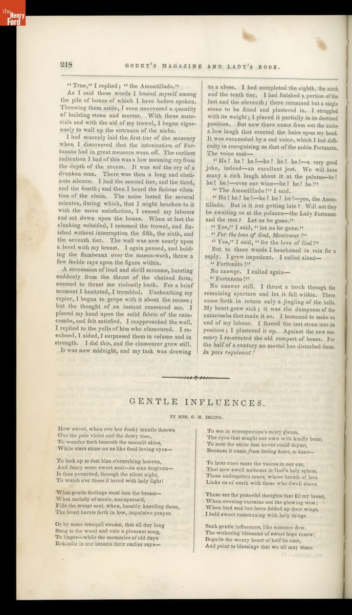 Godey's Lady's Book, later Godey's Magazine, was an American women's magazine published from 1830 to 1896. Sarah Hale, editor from 1837 to 1877, used the magazine to advance women's causes, particularly in the realm of education. It featured colored fashion plates, sewing patterns, sheet music, and works by notable authors. Several of Edgar Allan Poe's short stories were first published in Godey's.