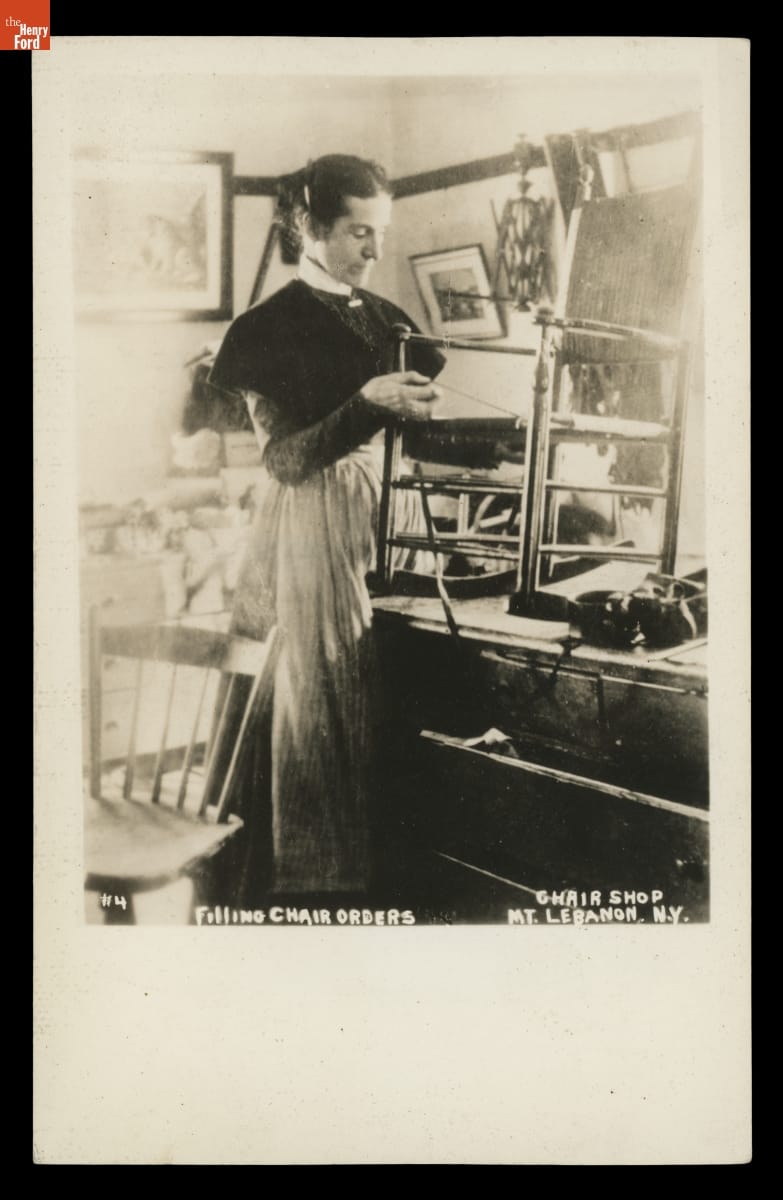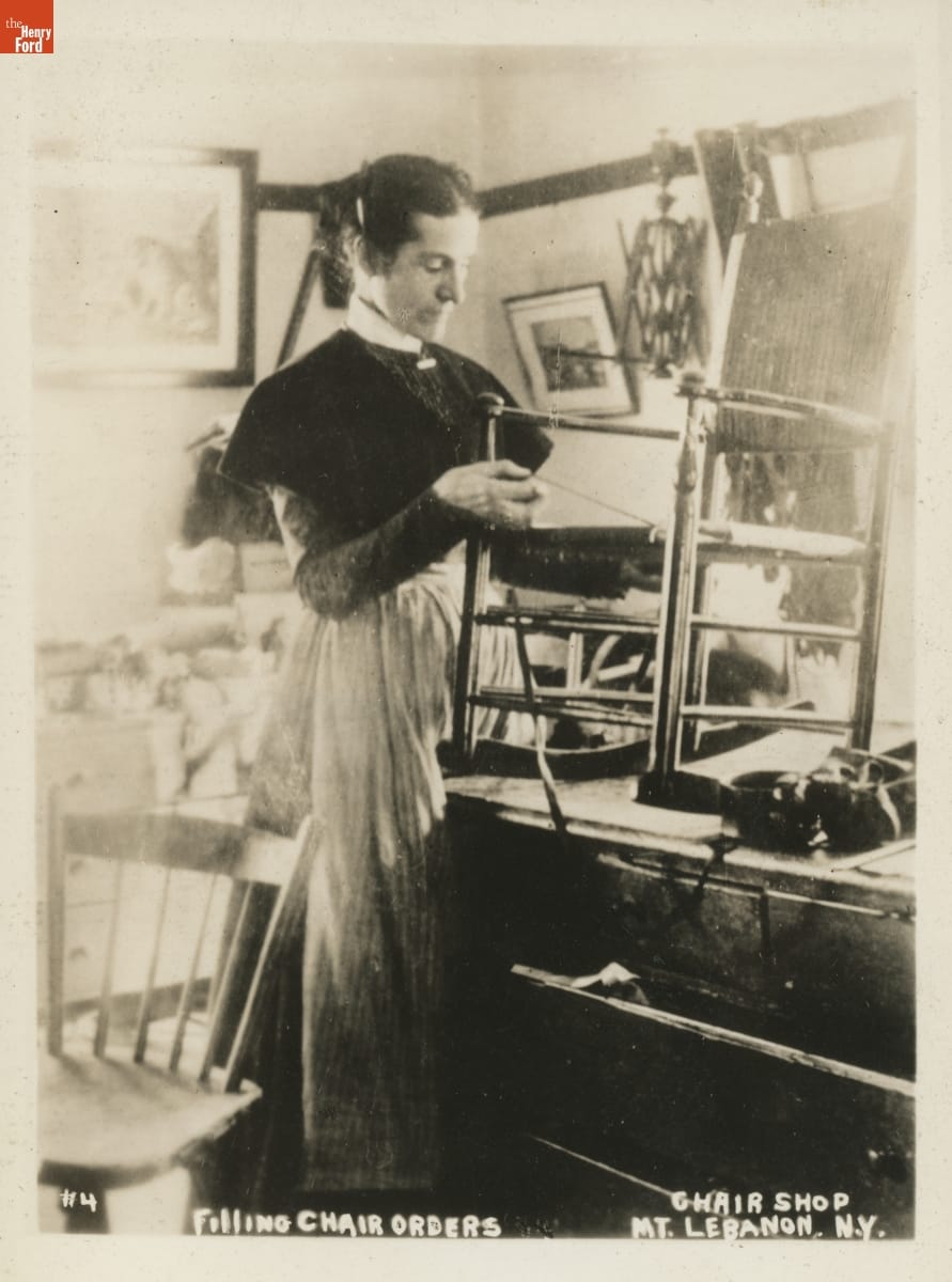 Eldress Sarah Collins Working on a Rocking Chair about 1890, "Filling Chair Orders, Chair Shop, Mount Lebanon, N.Y."