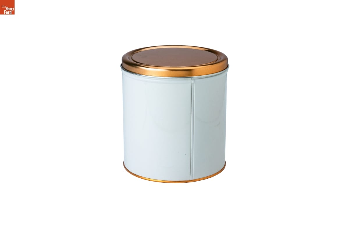 The Continental Can Company created a line of decorative metal kitchenware under the name Decoware in the 1950s. Items such as trays, cake tins, bread boxes, and canister sets often came in colorful floral, fruit, or plaid patterns. The company also produced this set of four graduated white canisters tastefully embellished with copper-colored lettering and a matching copper-colored lid.