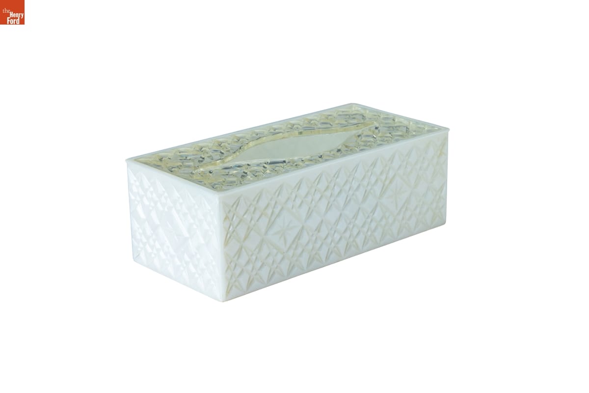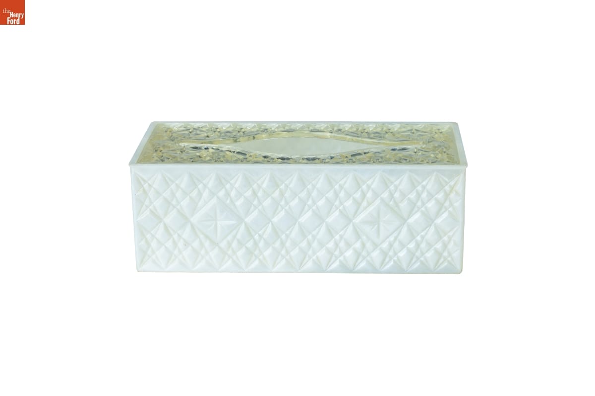 This tissue box cover from the early 1960s blends traditional and modern styles into a simple and functional household item. The star-and-diamond-molded plastic imitates the cut-glass trend popular at that time -- perfect for an upper-middle-class home.