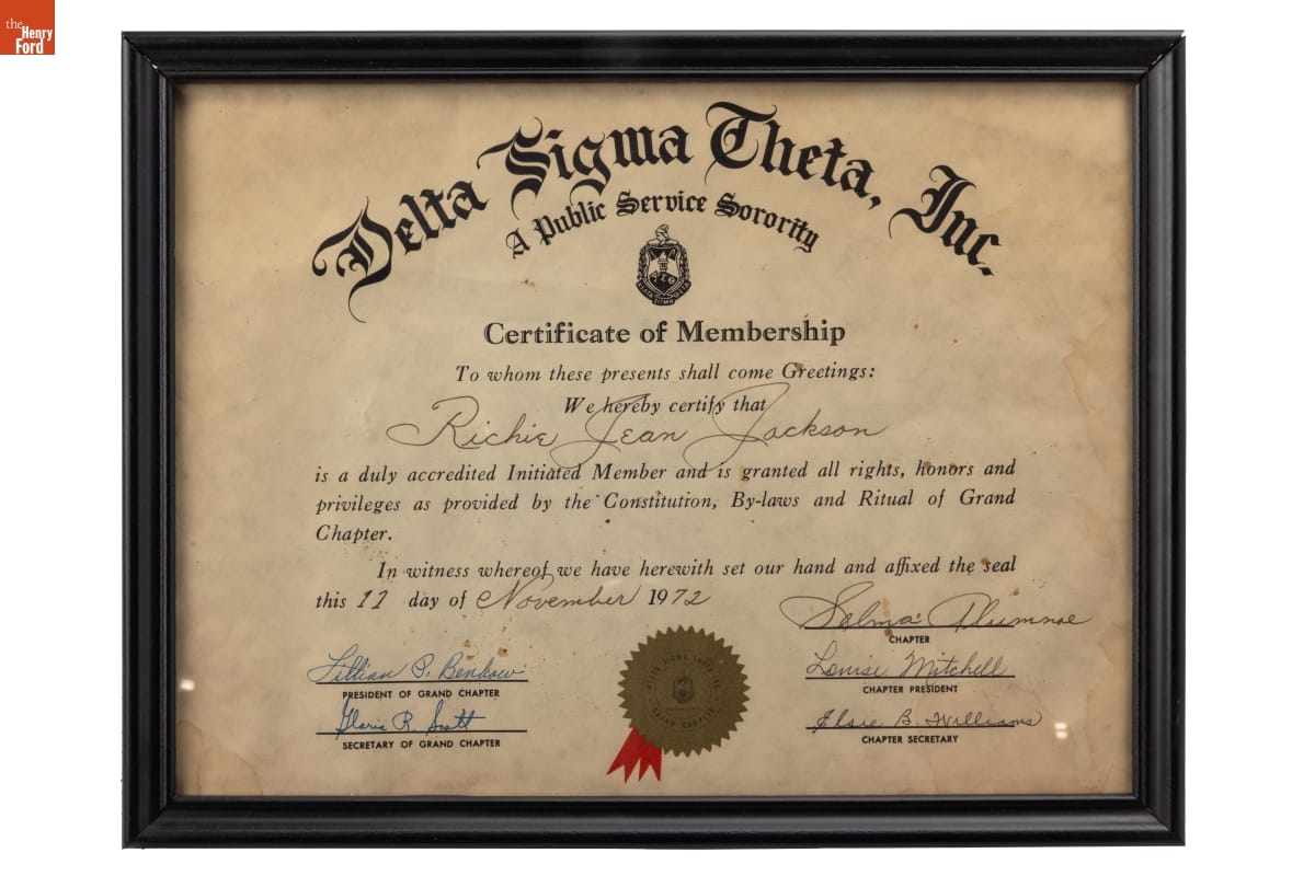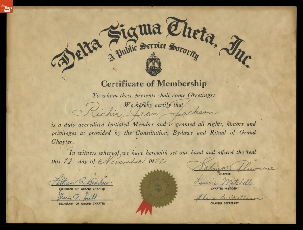 Delta Sigma Theta Inc. / A Public Serivce Sorority / [sorority crest] / Certificate of Membership / ... Richie Jean Jackson / [descriptive text] / this 11 day of November 1972 / Chapter: Selma Alumnae / [names of grand chapter president, grand chapter secretary, chapter president, and chapter secretary].