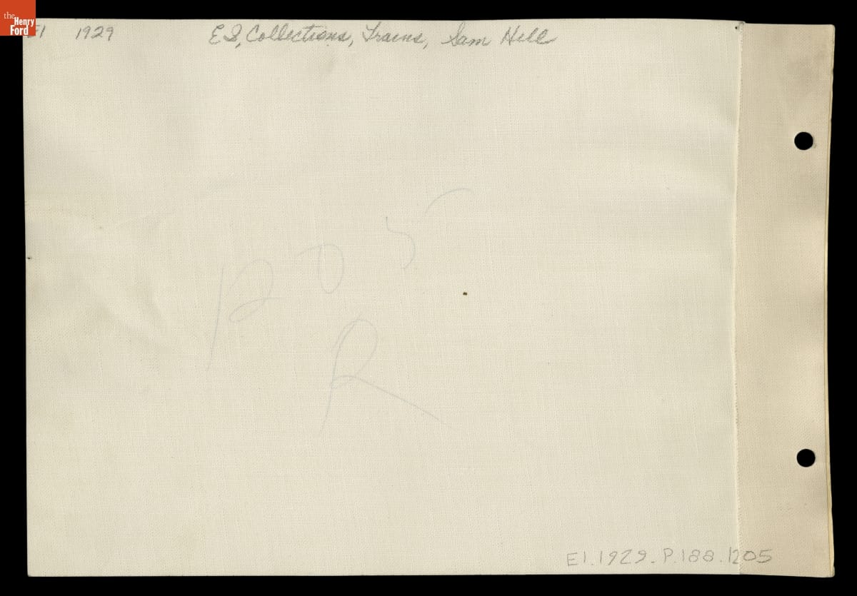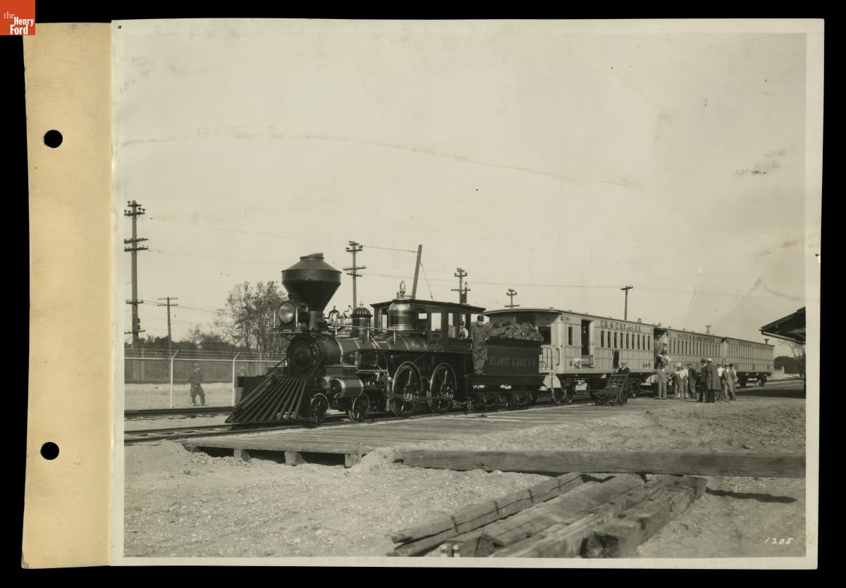 The 1858 steam locomotive Sam Hill, together with a replica baggage car and two replica passenger cars built to resemble equipment of the same era, was photographed in Greenfield Village in 1929. The baggage car was lettered for the Chicago, Detroit & Canada Grand Trunk Junction Railroad, on which a young Thomas Edison once old newspapers to passengers.