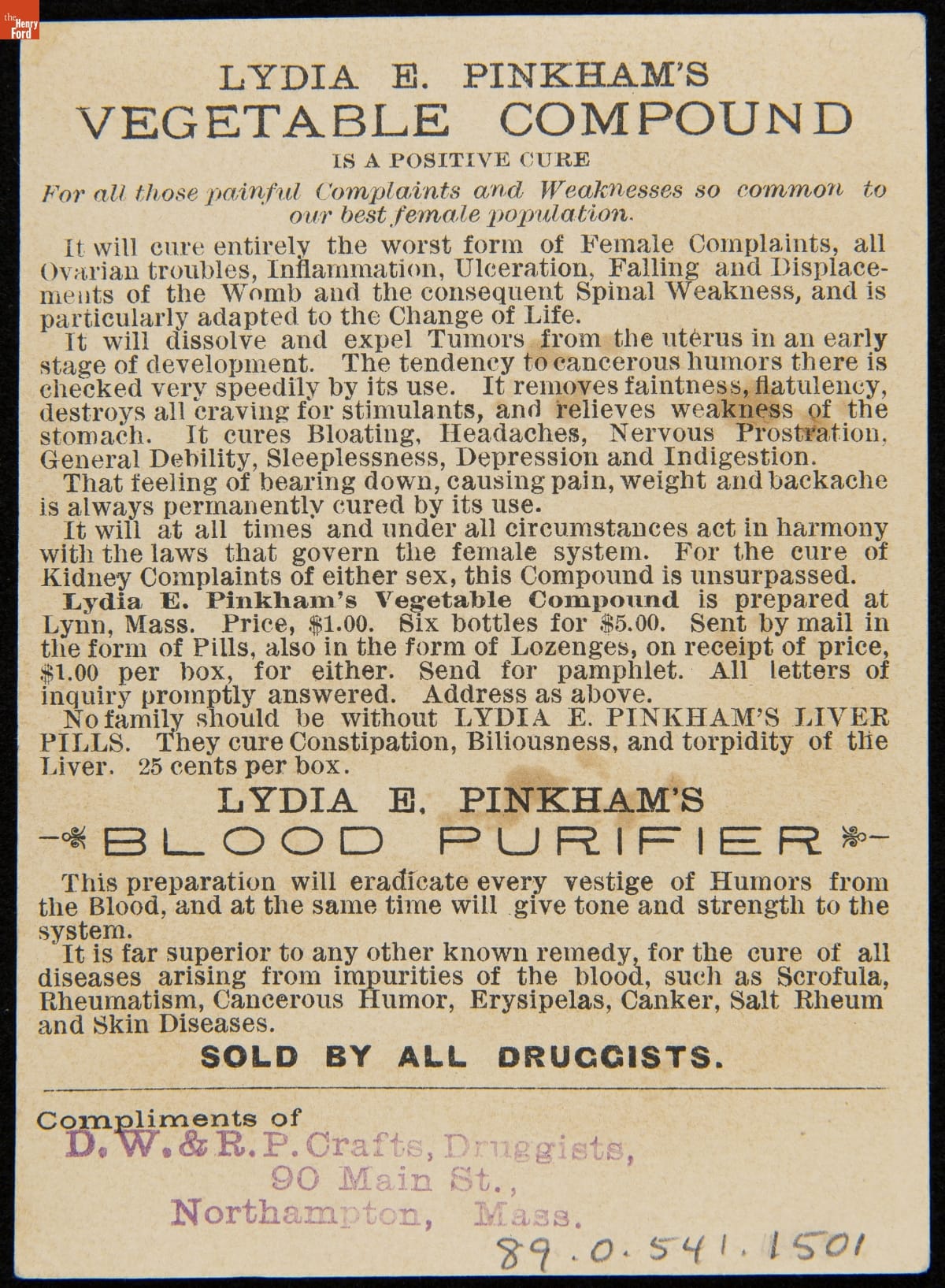 Advertised product by Lydia E. Pinkham Medicine Company, Lynn, Mass., sold by D.W. & R.P. Crafts, Northampton, Mass. Card by J.H. Bufford & Company,