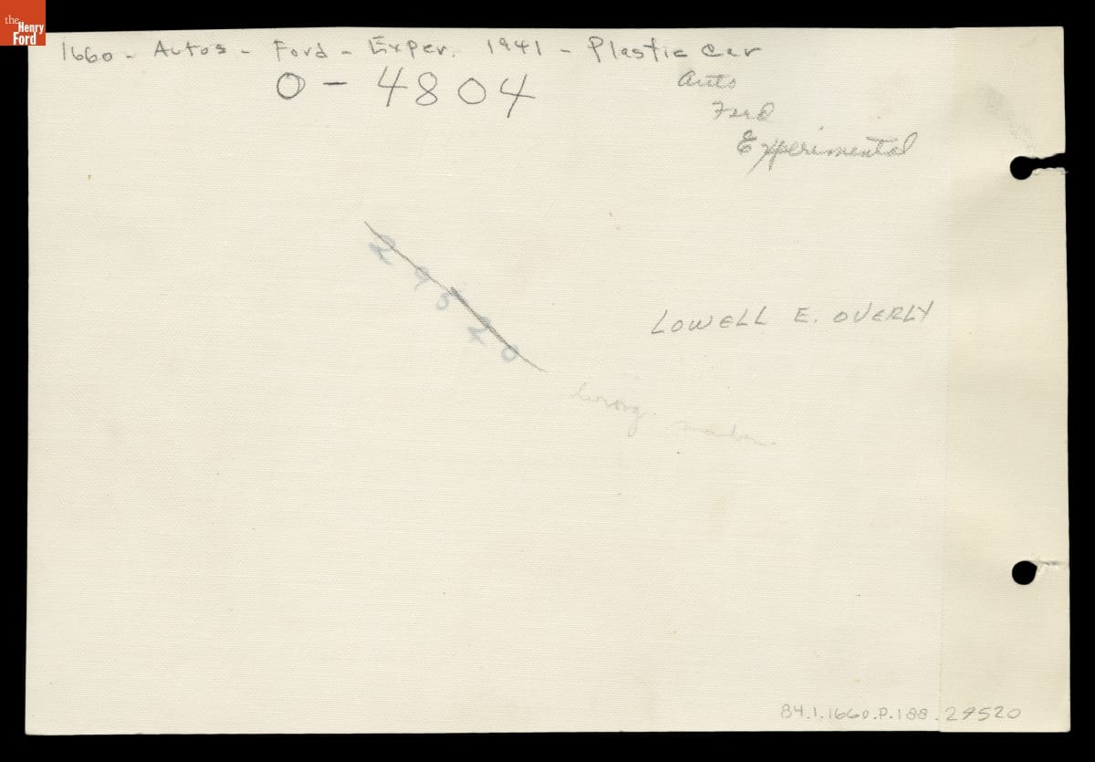 Lowell Overly made molds for the soy-plastic instrument knobs used in Ford automobiles in the 1930s. Given Overly's experience, Henry Ford appointed him to work with chemist Robert Boyer and Ford's design department on an experimental "soybean car" with a complete soy-plastic body. One functional prototype was built in 1941, but World War II ended further work on the concept.