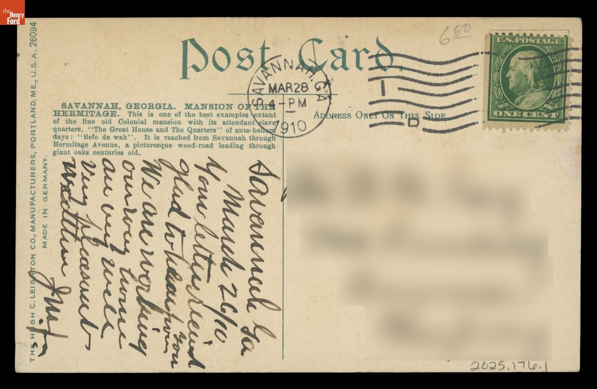 "Savannah, Georgia, Mansion of the Hermitage," Postmarked March 28, 1910